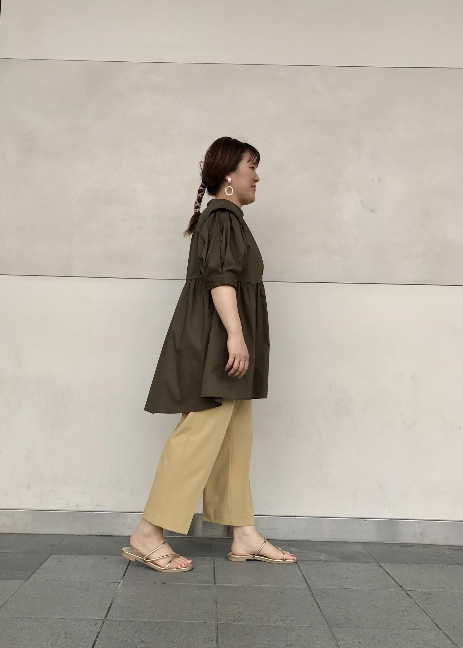 落ち着いたカーキを使った今年らしいチュニックブラウスに、キレイ目パンツを合わせたサマーダークスタイルです♪