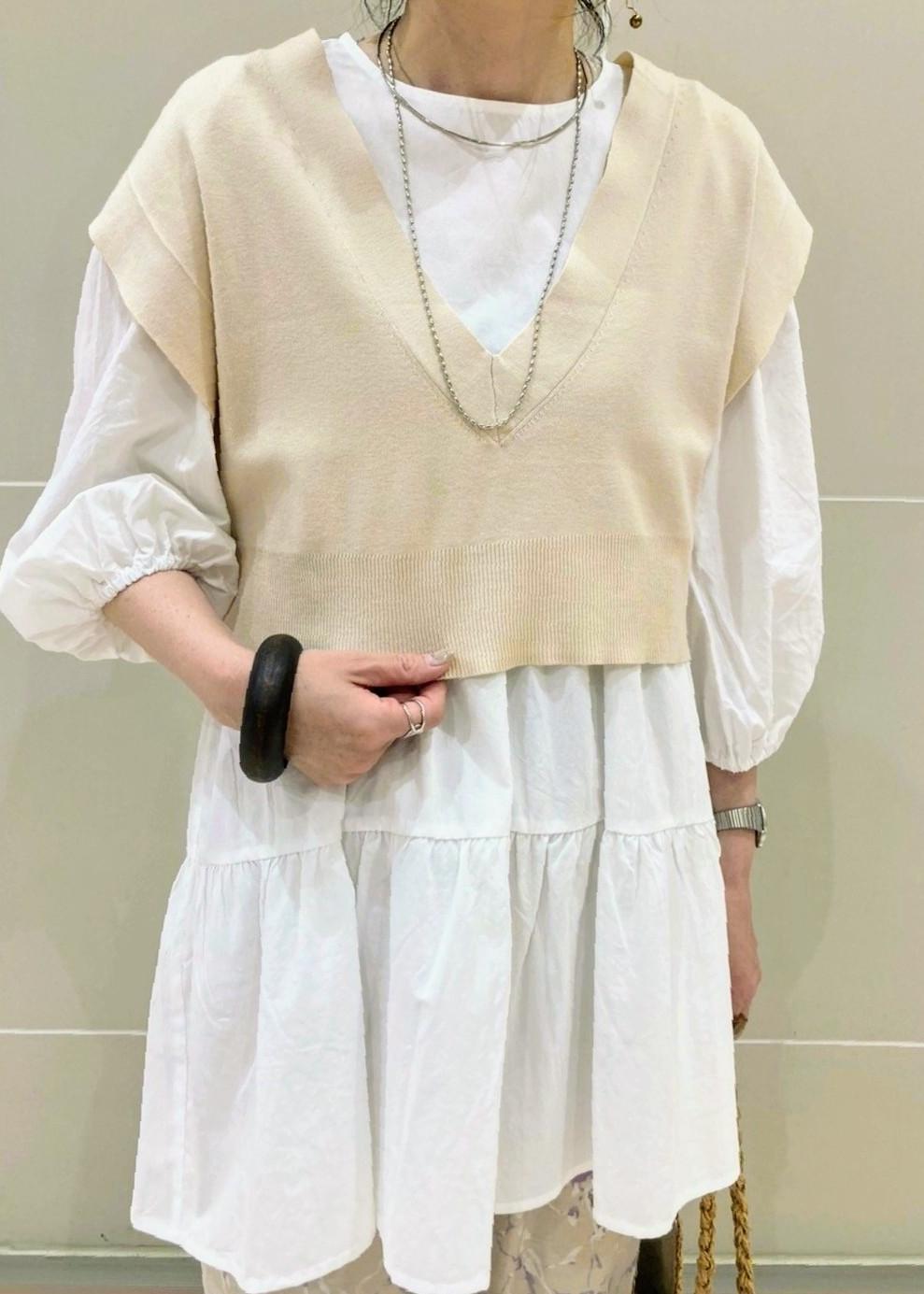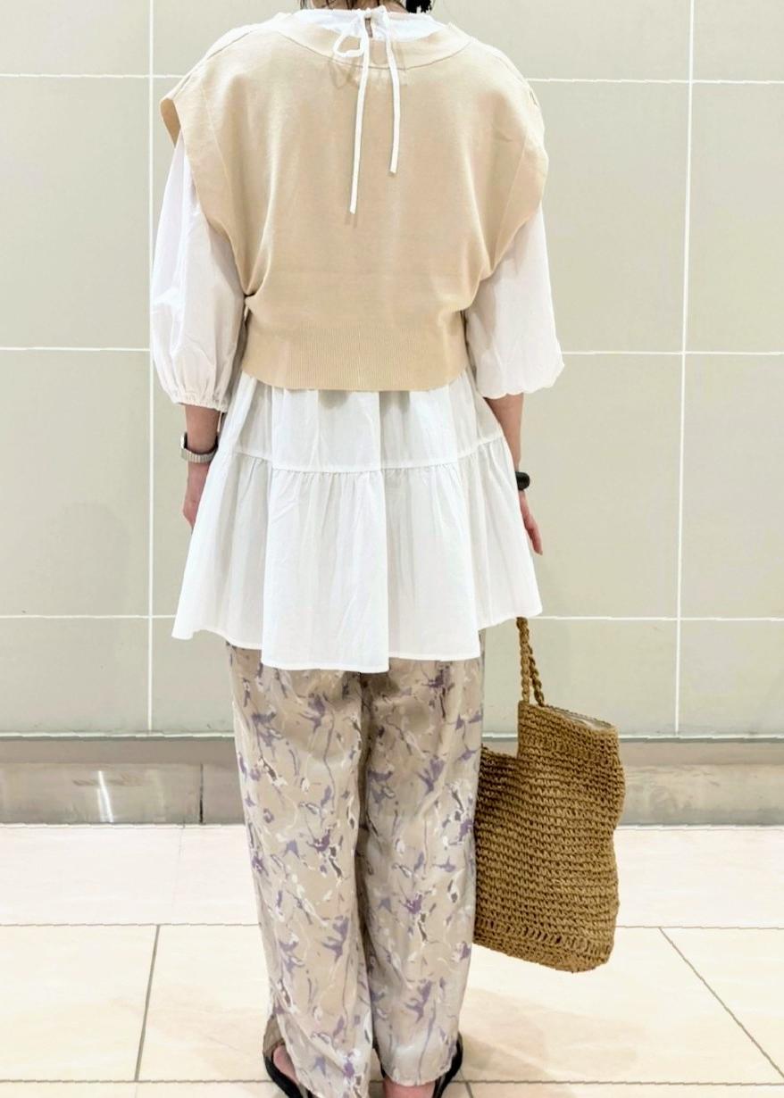 1枚でも可愛いトレンドのティアードブラウスに、ニットベストを合わせて、甘くなりすぎないカジュアルなコーディネートにしました。