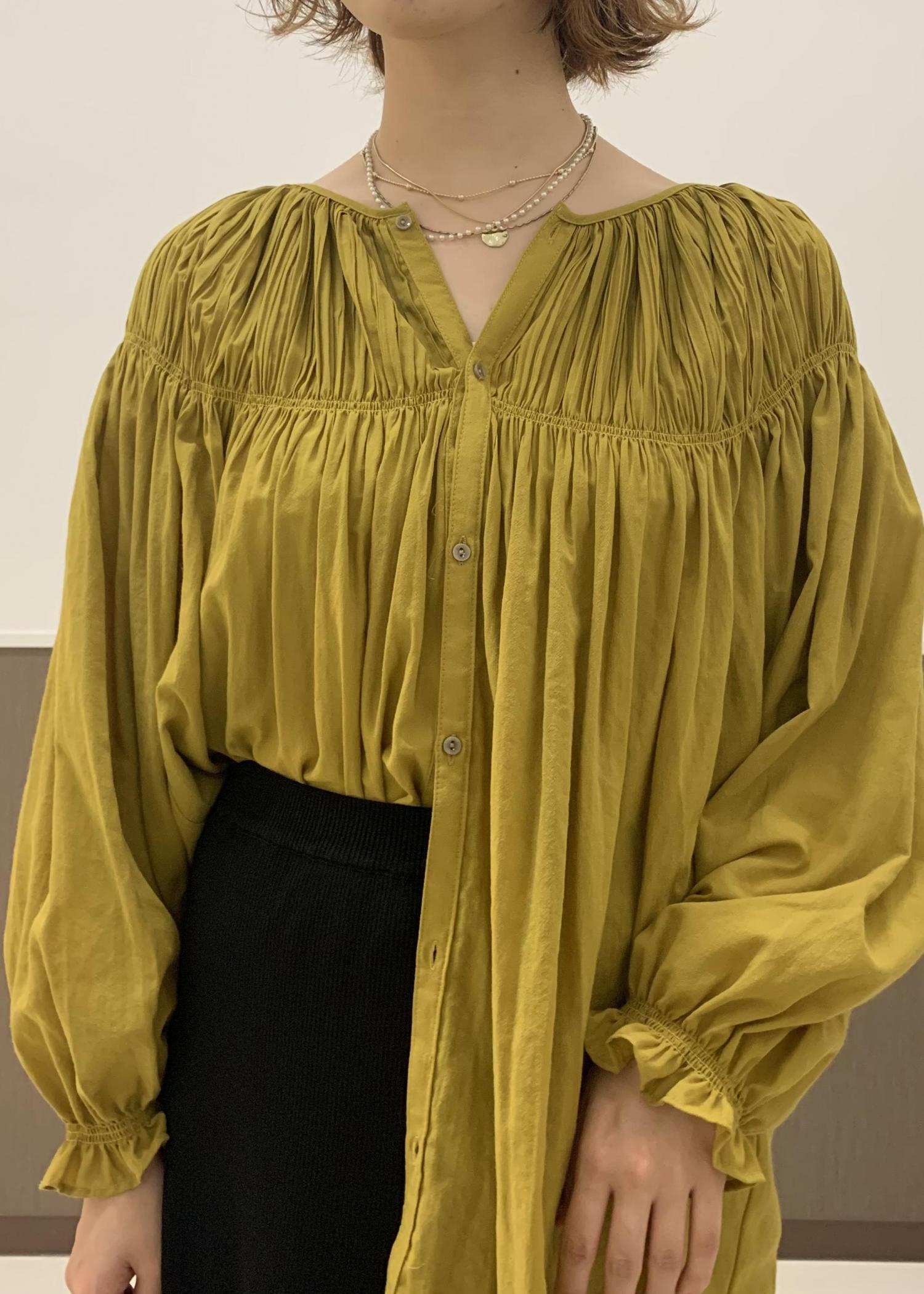 ギャザーがたっぷり入ったデザインでデコルテ周りもスッキリ見えので一枚着るだけでも、オシャレ感が増す優秀なブラウスです。