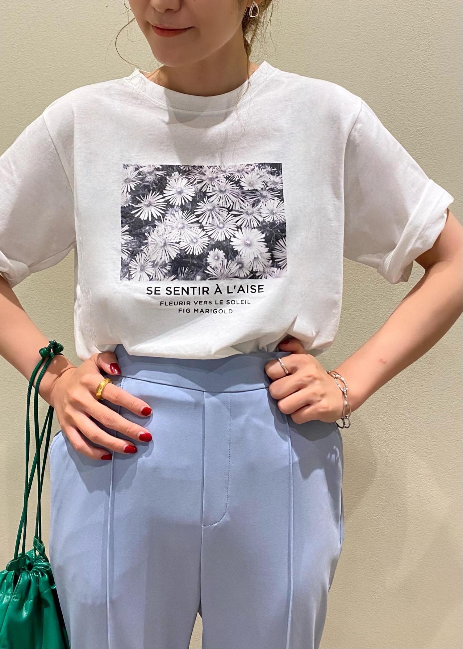 夏には一枚活躍するデザインTシャツに今年らしいカラーボトムを合わせてみました♡サックスカラーが涼しさや大人のオシャレ感を演出します♪小物も遊び心をくわえたグリーンカラーを差し色にしてみました。