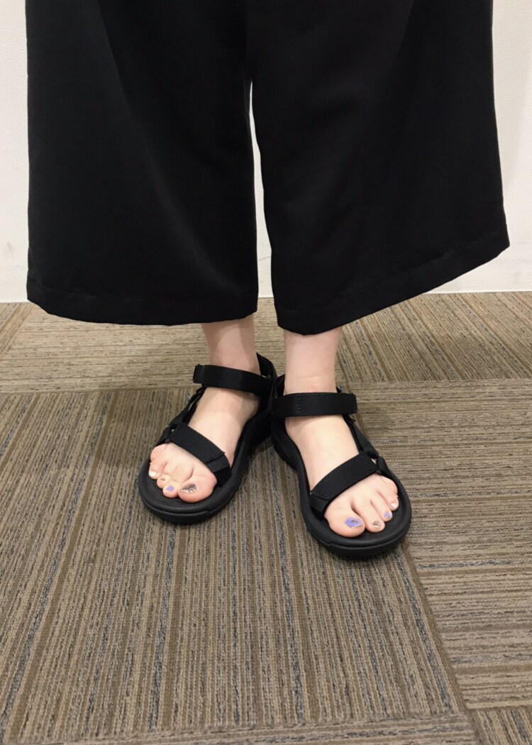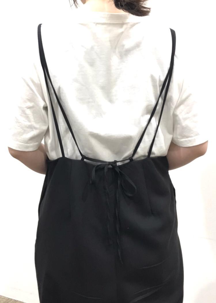 黒のオールインワンを Tシャツ合わせでカジュアルにした、大人なモノトーンコーディネートです。