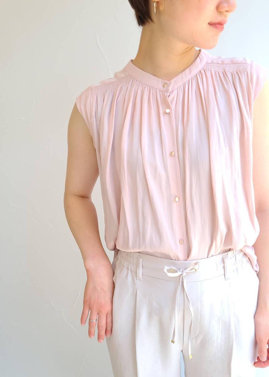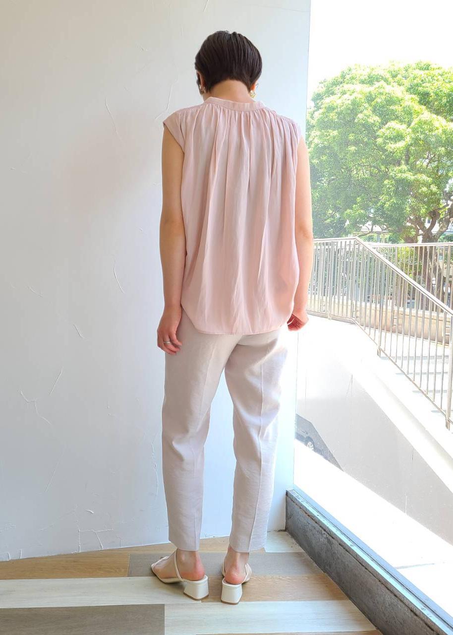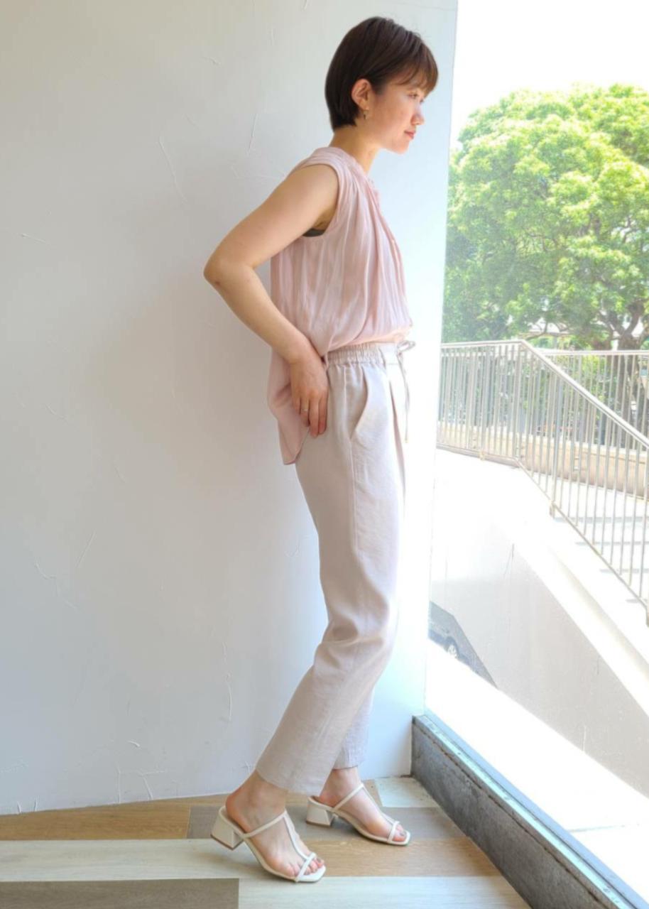 肌に馴染むヌーディーなピンクのブラウスを使ってコーディネートしました。 全体的にホワイト系ワントーンでまとめたのがポイントです。 ピンクのブラウスできれい見えするコーディネートにしてみましたが、ボトムス次第でがらっとイメージを変えてカジュアル系のコーディネートにするのもアリです!是非お試しください♪