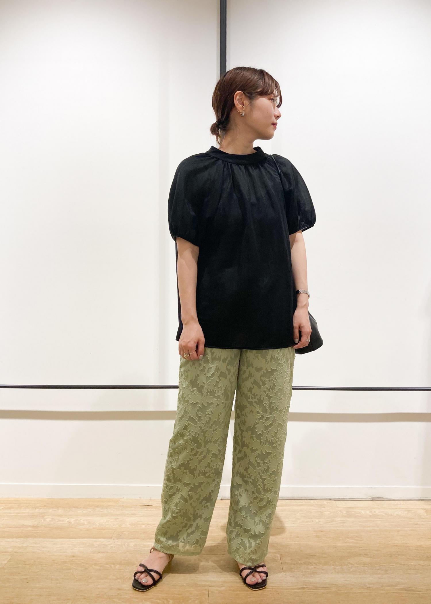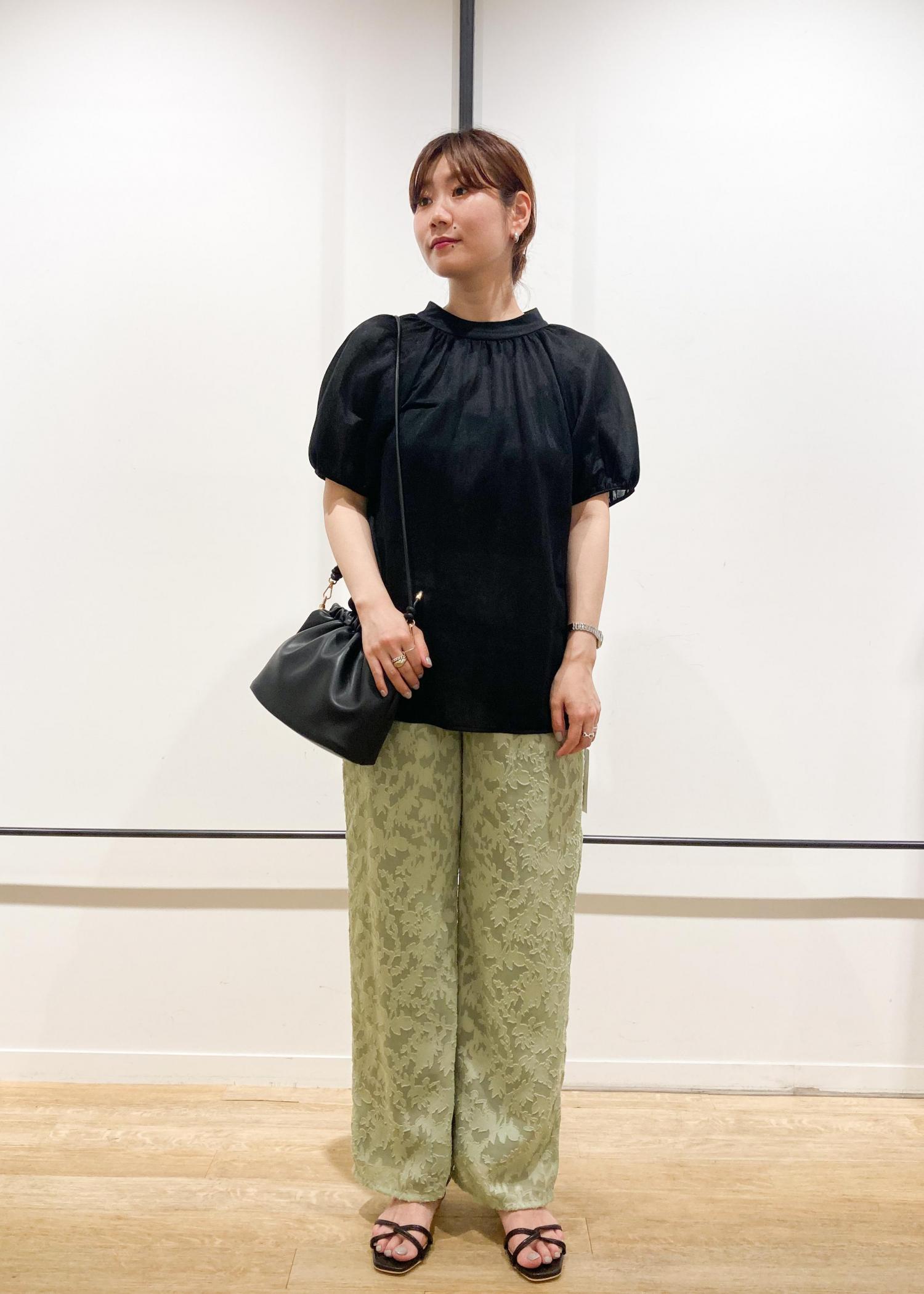 カラーパンツを大人っぽくシンプルに合わせて見ました。 他アイテムをブラックでまとめることで、カラーアイテムを目立たせつつシックな印象に。 今年のトレンドのシアー感のあるアイテムを合わせることで、ブラックなどのカラーも重たくならず涼しげな印象になります。