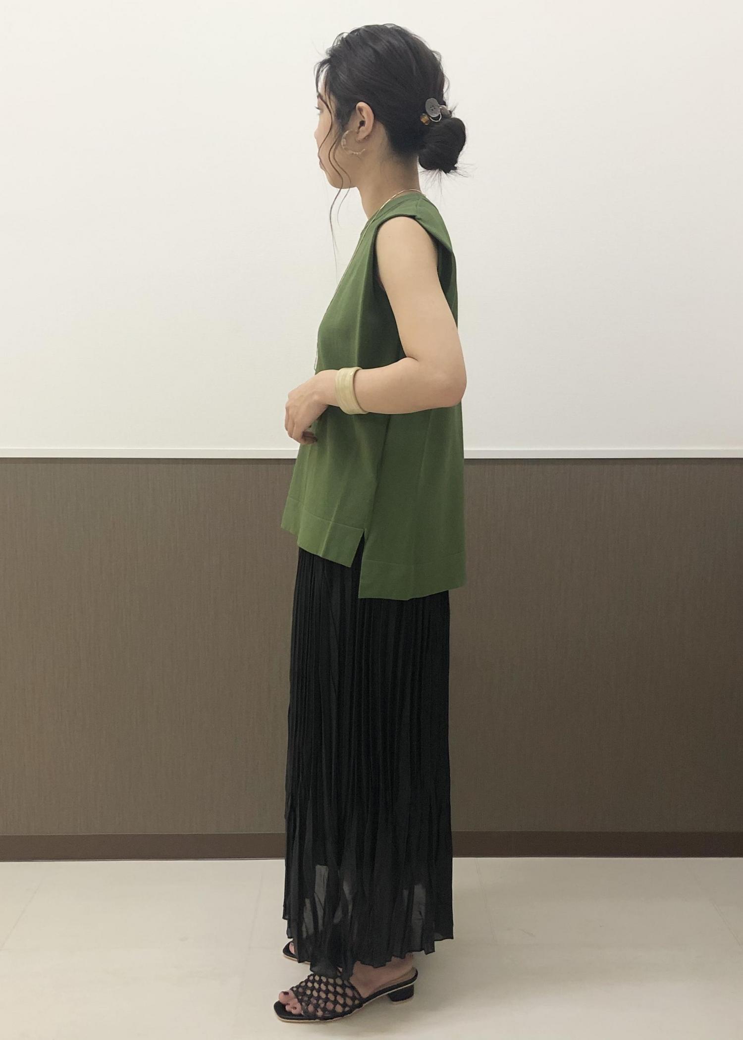 綺麗なグリーンのノースリーブを主役に、涼しげな素材のスカートやサンダルを合わせて夏らしいコーディネートにしました。