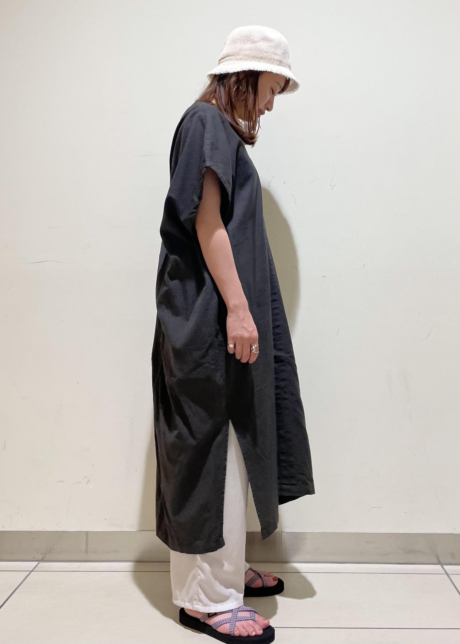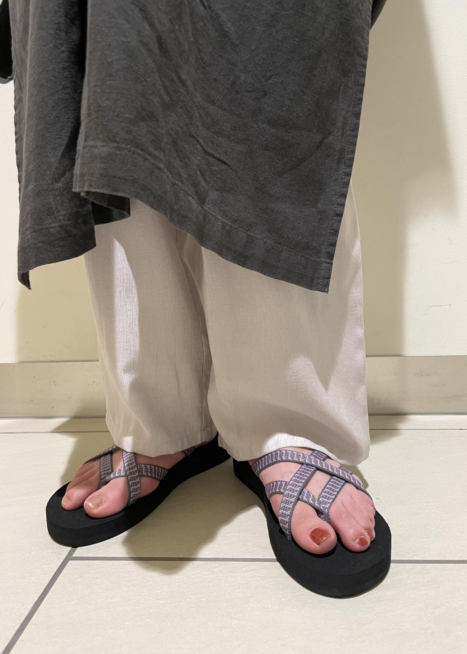 ブラック×ホワイトでまとめ、パープルのサンダルをアクセントに。全体的にリラックスしたアイテムですが、カラー使いでおしゃれ見えします。