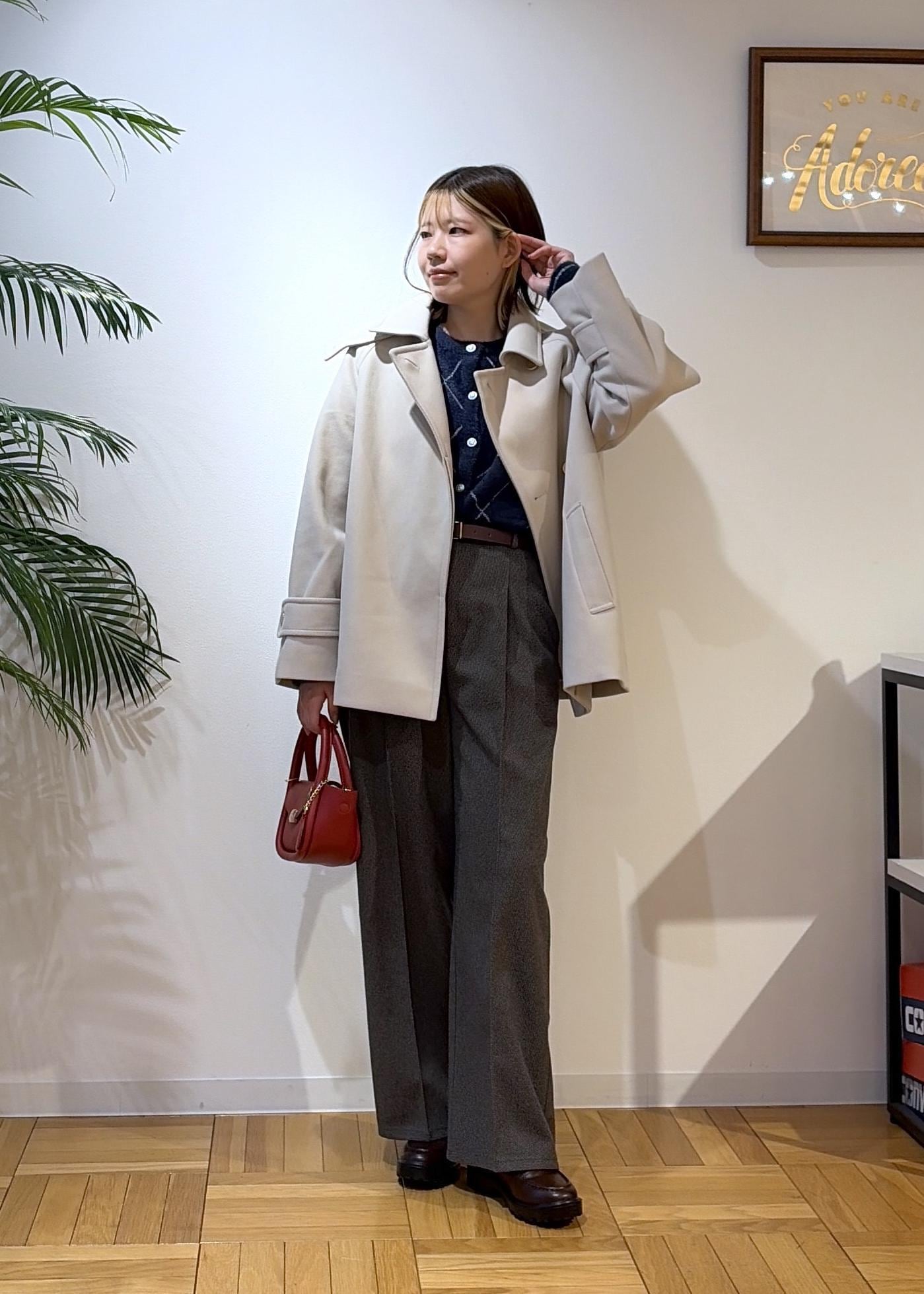 キレイなパープルカラーの前開きワンピースを羽織としてコーディネートしました。 ワンピースがメインになるよう他の色はモノトーンで合わせました。