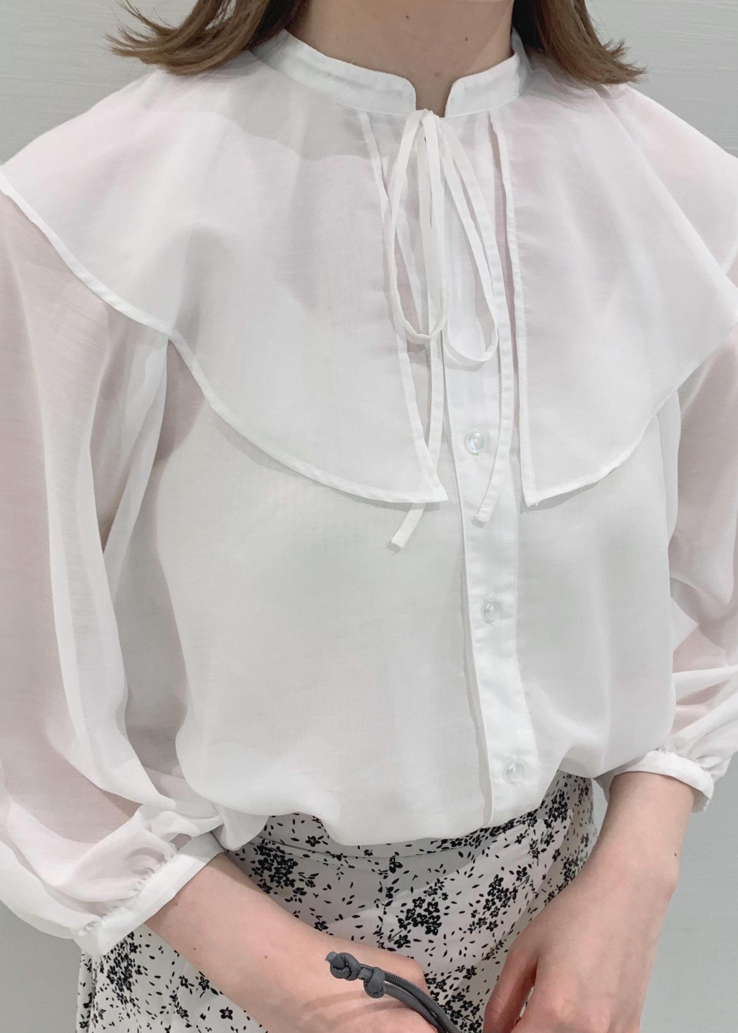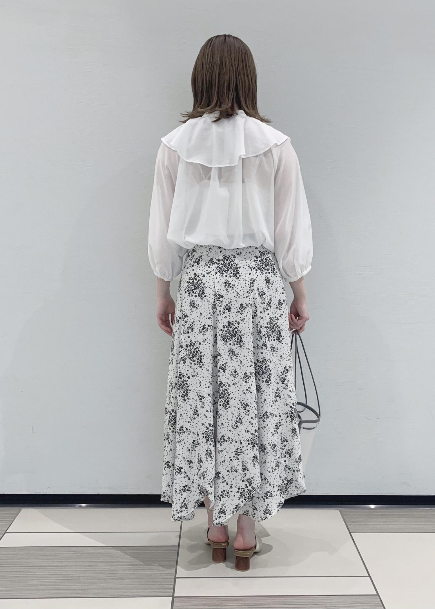 デザイン性のあるブラウスと花柄のトレンド感のあるスカートを合わせ、フェミニンな雰囲気に仕上げました! 白で統一感を出し、夏らしいコーディネートに!