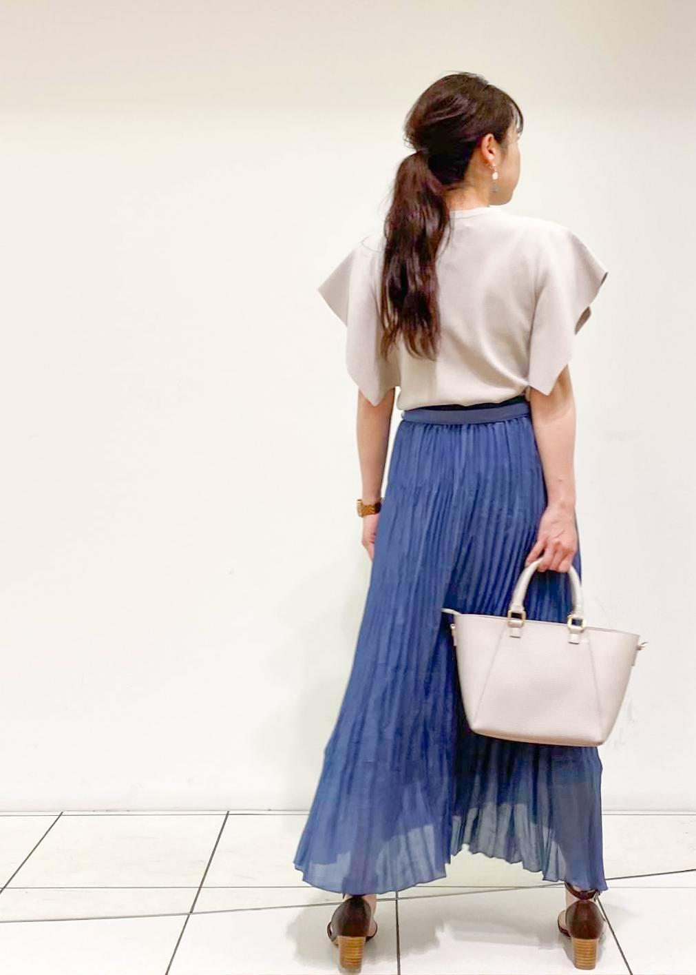 フレア袖のきれいなシルエットとアシンメトリーのプリーツスカートが一気に女性らしいスタイルに。 足元は大人なブラウンカラーで落ち着きのある雰囲気に。