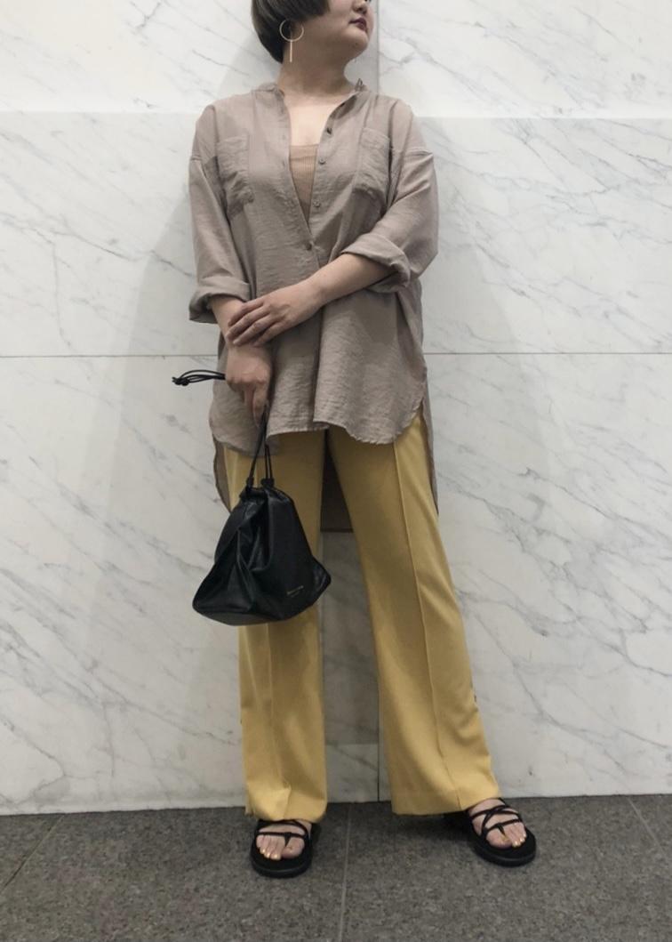 鮮やかなパンツのイエローをアクセントにしたシャツコーデ。