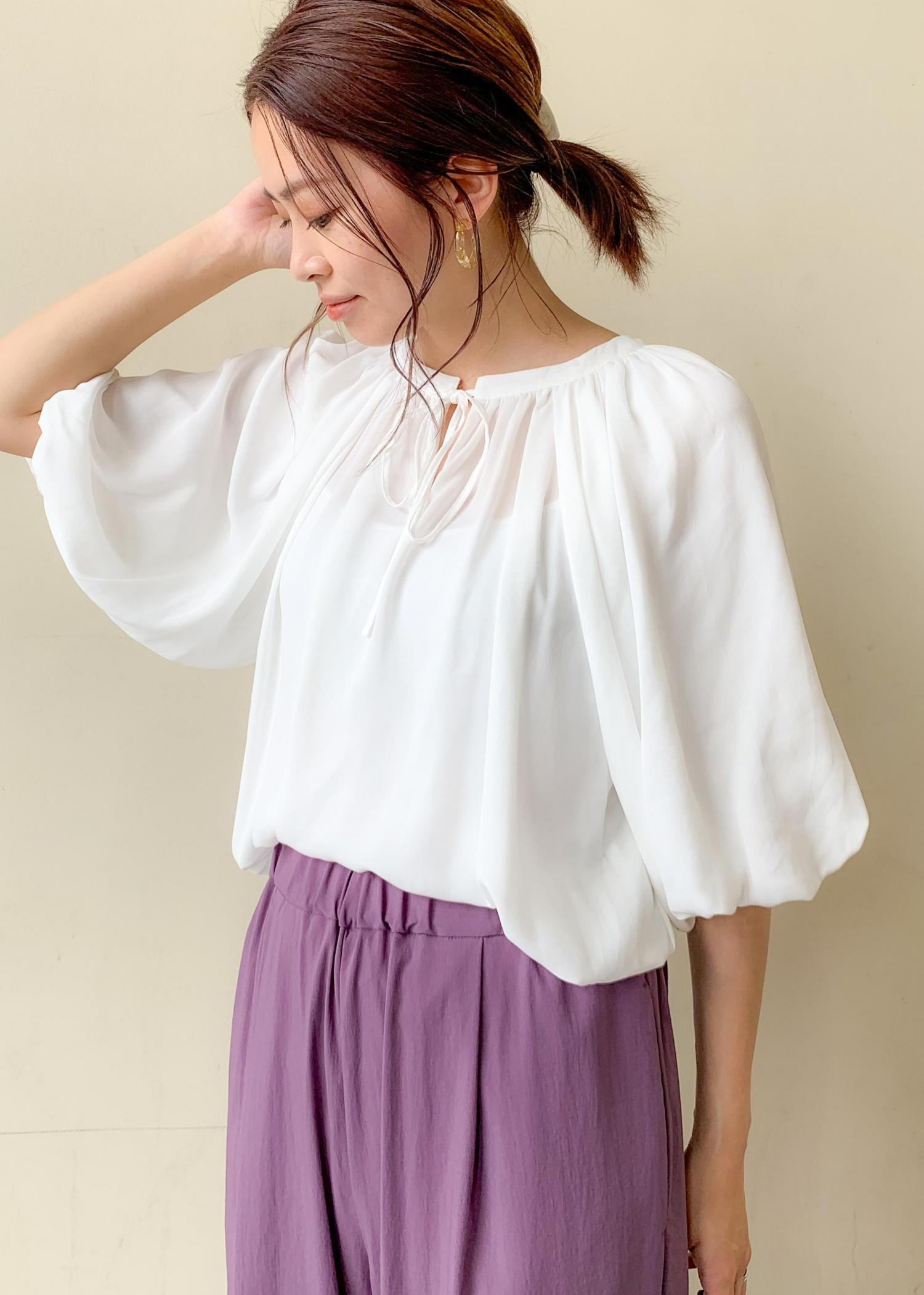 トレンドのふんわり感のあるボリューム袖のブラウスは、サラサラした素材が気持ち良い着心地です。