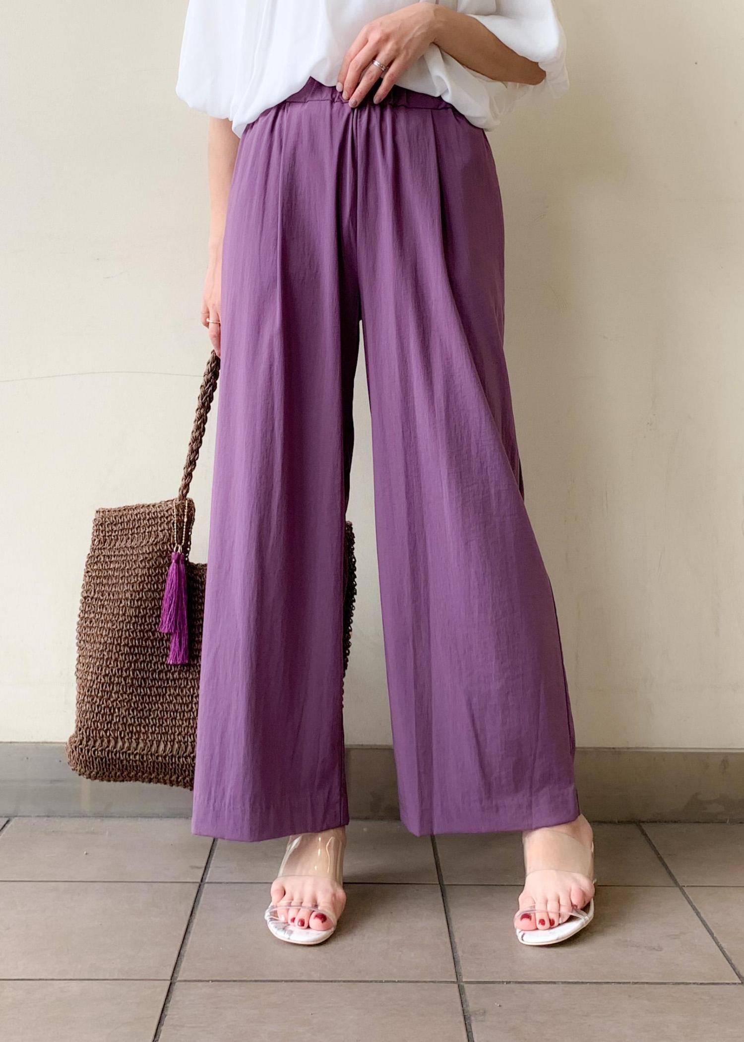 夏に着やすい楽ちんワイドパンツは、1枚で主役になるパープルで女性らしいカラーです。