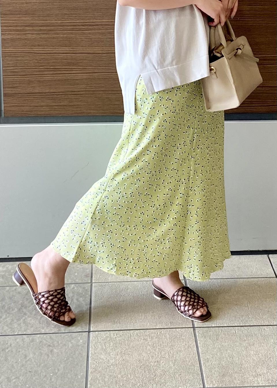 おすすめコーデ:デザインと柄がポイントのスカートなので、トップスはシンプルなトップスや今年らしいTシャツ合わせのカジュアルコーデもおすすめです。