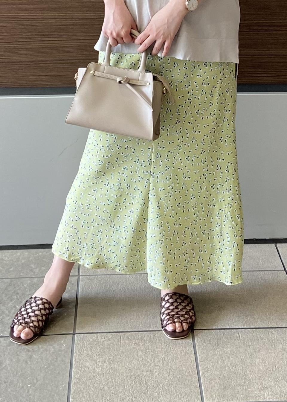 夏らしい鮮やかなイエローの花柄スカートにベーシックなトップスを合わせたフェミニンコーディネートです。小物はベージュのトーンで合わせてバランス良くしました。