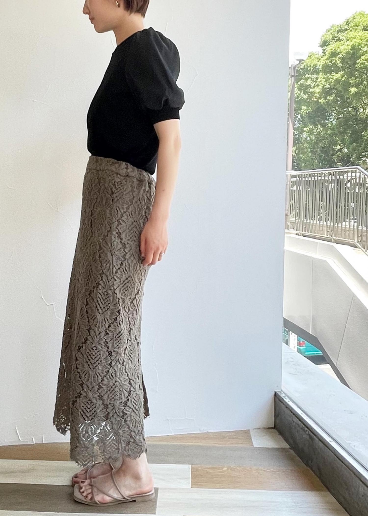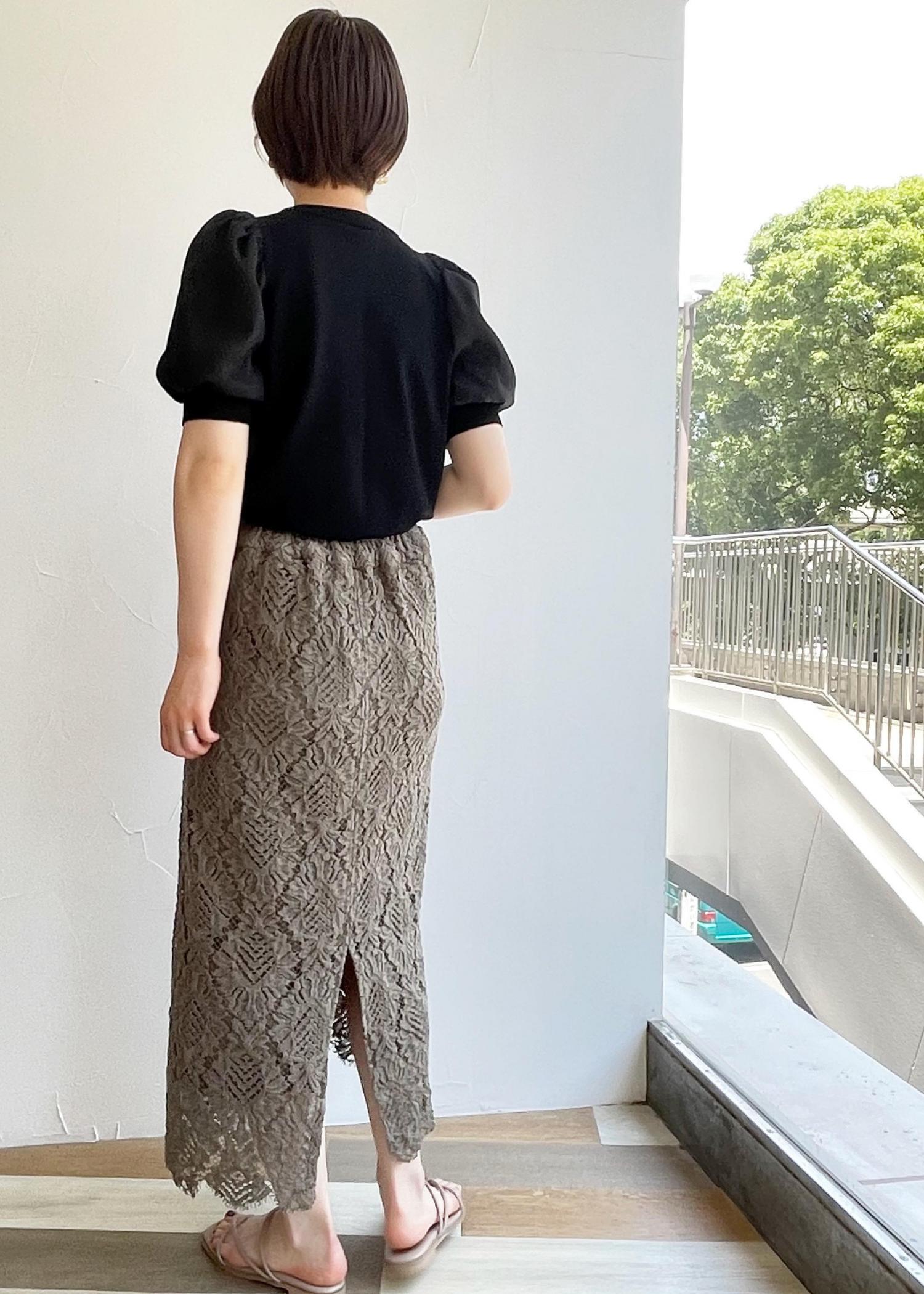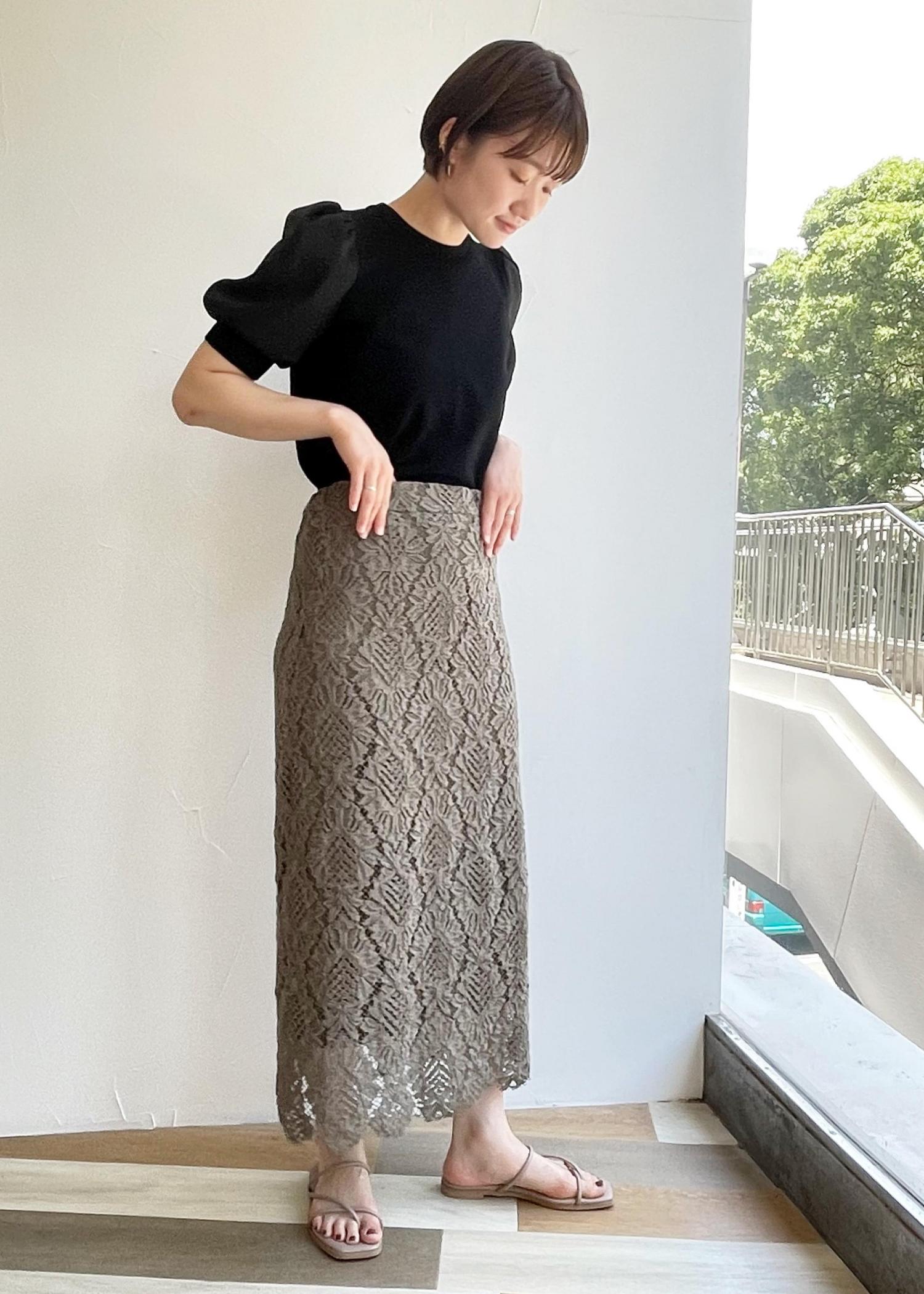 オーガンジーのお袖が可愛いパワーショルダープルオーバーを使ったコーディネートです。 アウトスタイルで着てもすっきりとした着丈になりますが、今回はインスタイルでよりメリハリを出しました。 今季トレンドのサマーダークカラーを意識して甘すぎないスタイルを作ったのがポイントです。