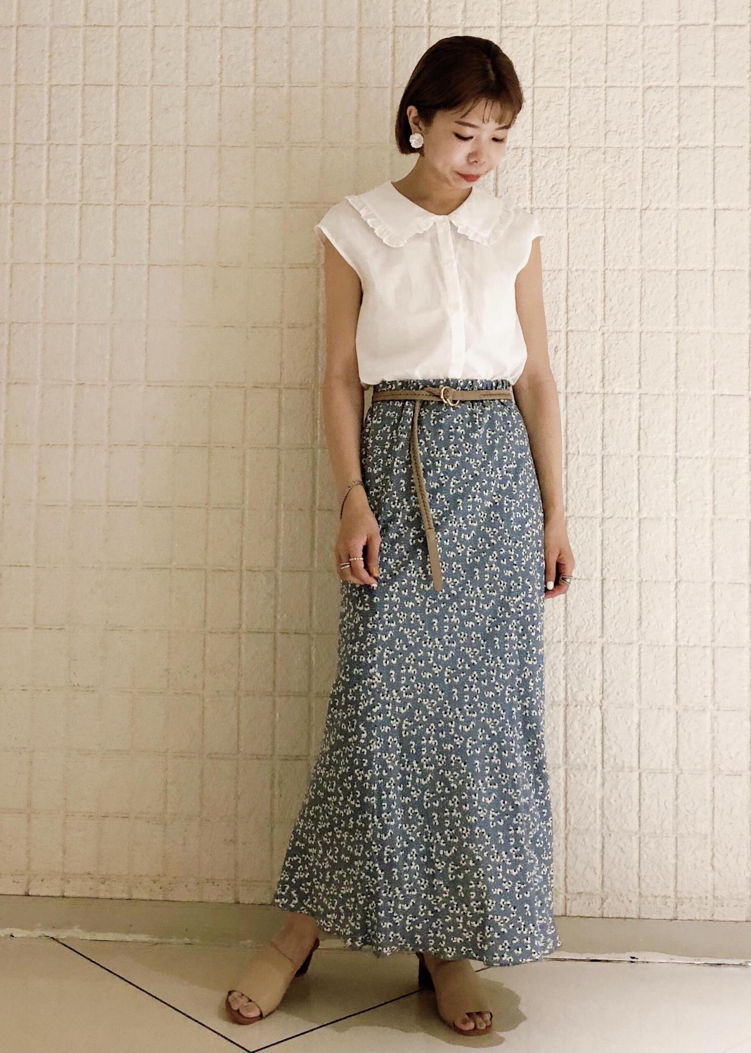 サイズ感:着丈が調節可能なスカートですが、折り返さずそのまま履いて足首が見える丈感です。