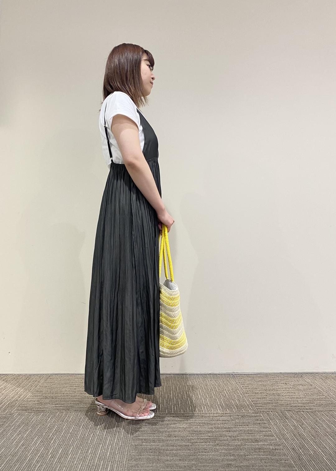 女性らしい雰囲気のプリーツのキャミワンピに、あえてシンプルなTシャツを合わせ、大人っぽく着てみました!