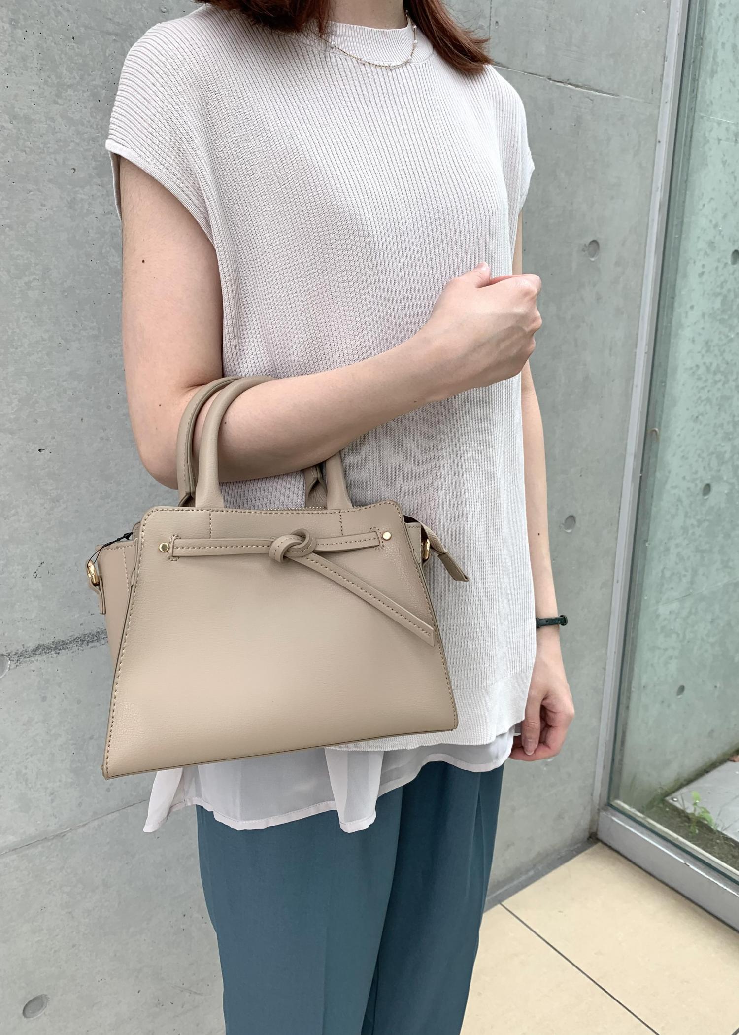 綺麗めすぎない、オフィスカジュアルなコーディネートにしました。トップスと小物をベージュ系に合わせ差し色に、パンツのグリーンを取り入れたのがポイントです。