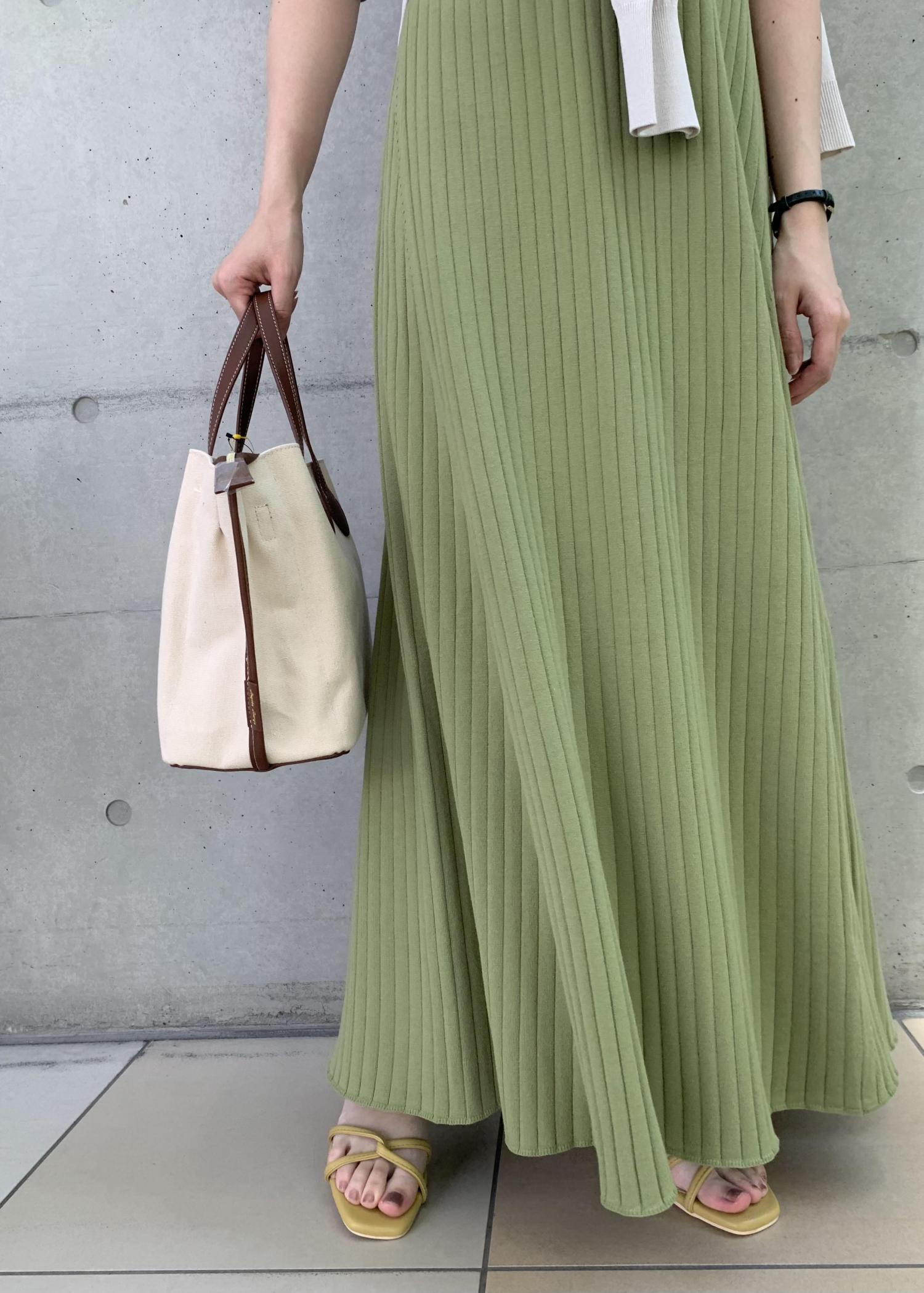 グリーンの丈感のあるワンピースに、ワンポイントでカーディガンを斜めがけで合わせました。 シンプルなワンピースなので、首元にアクセサリーを合わせると簡単にお洒落なコーディネートになります。