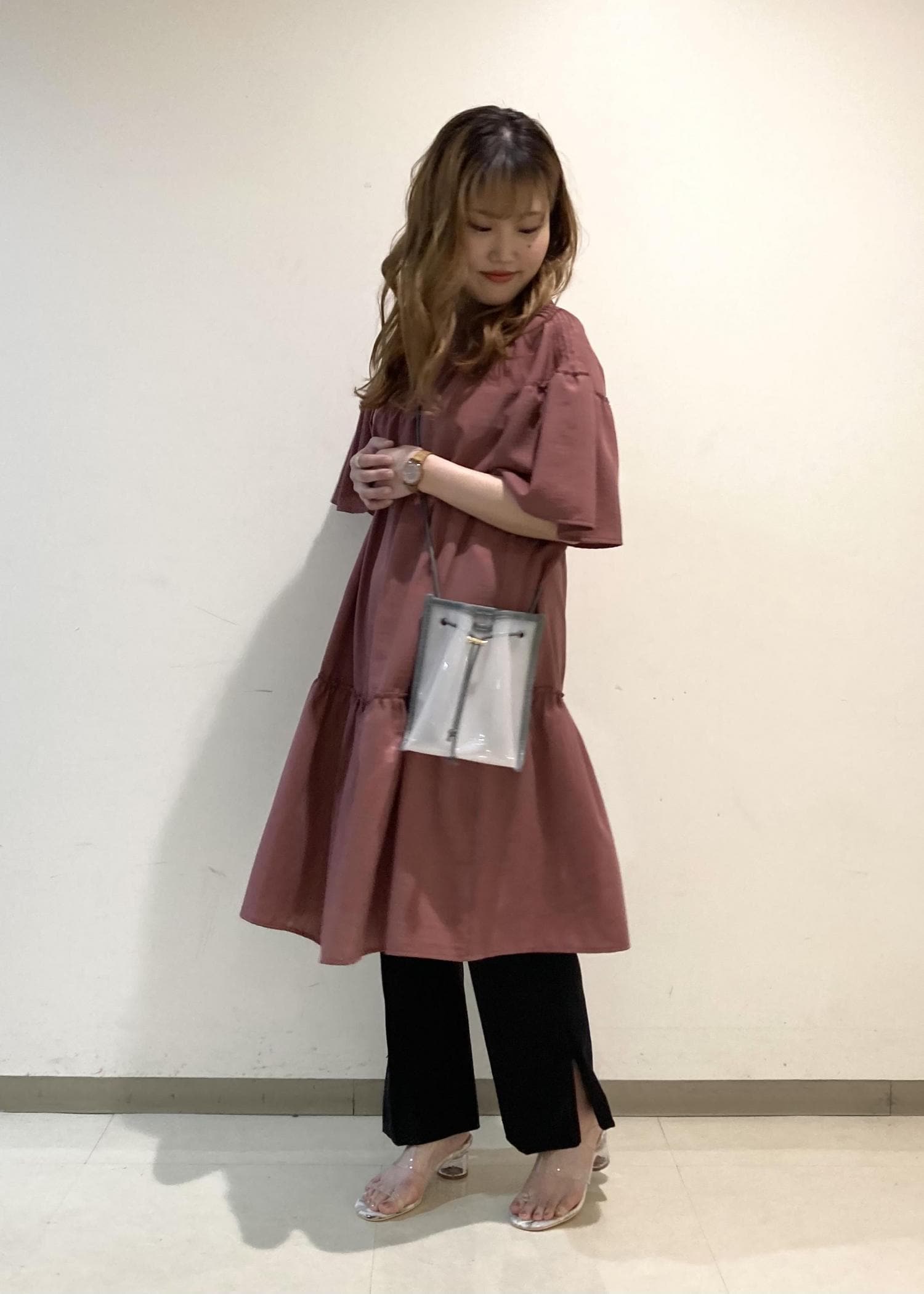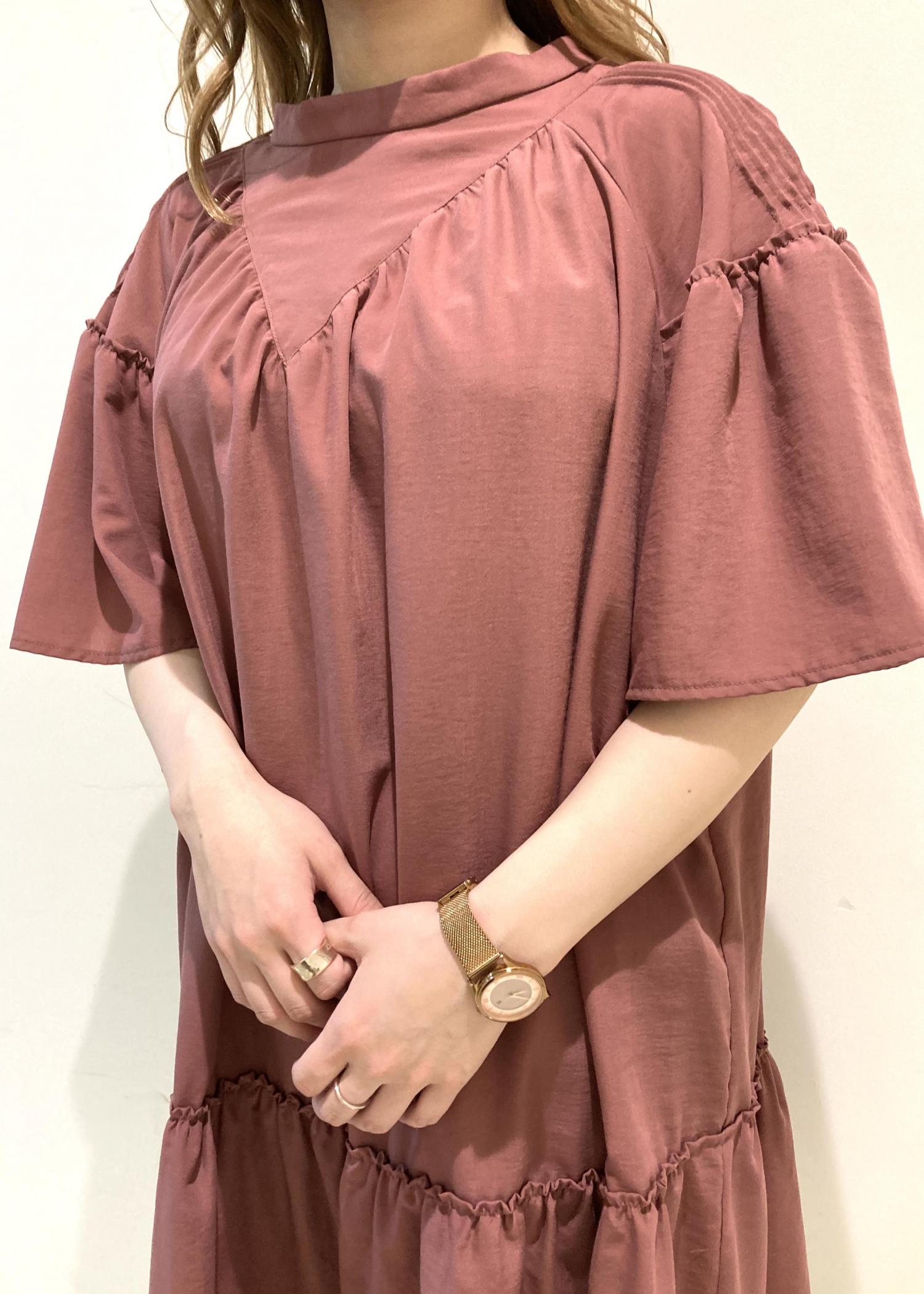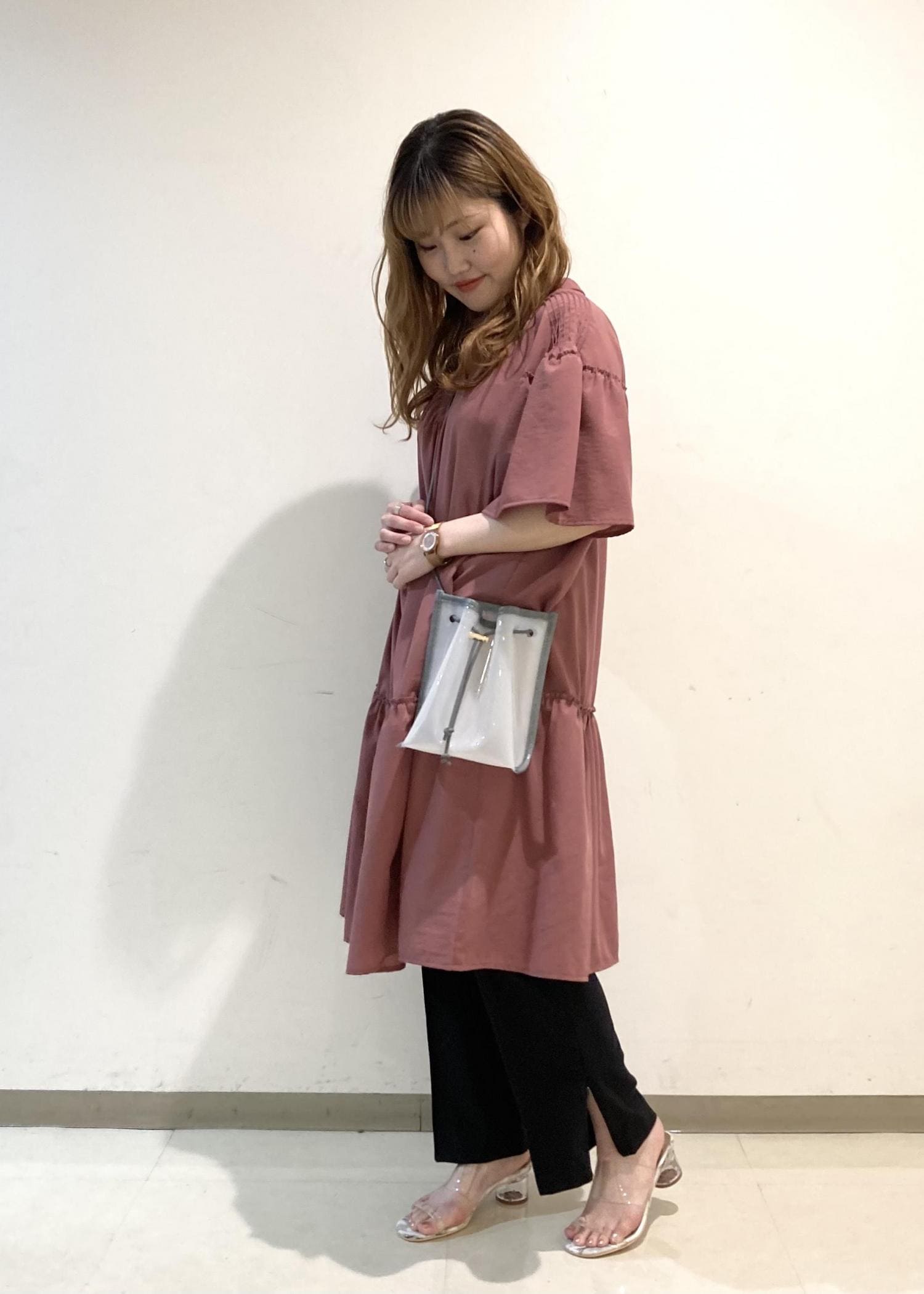 今季注目のミニワンピスタイルです! 短めの丈感と、ギャザーのデザインが女性らしくとても可愛いです。 足を出すのに抵抗がある方は今回のようにパンツを合わせたスタイリングもおすすめです!