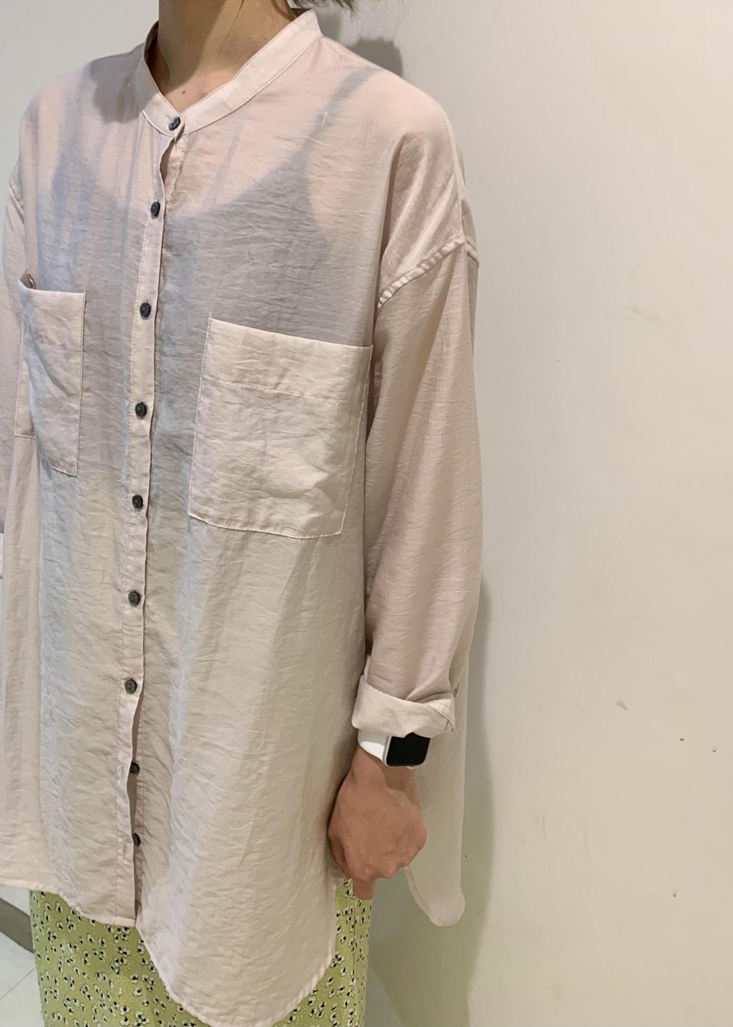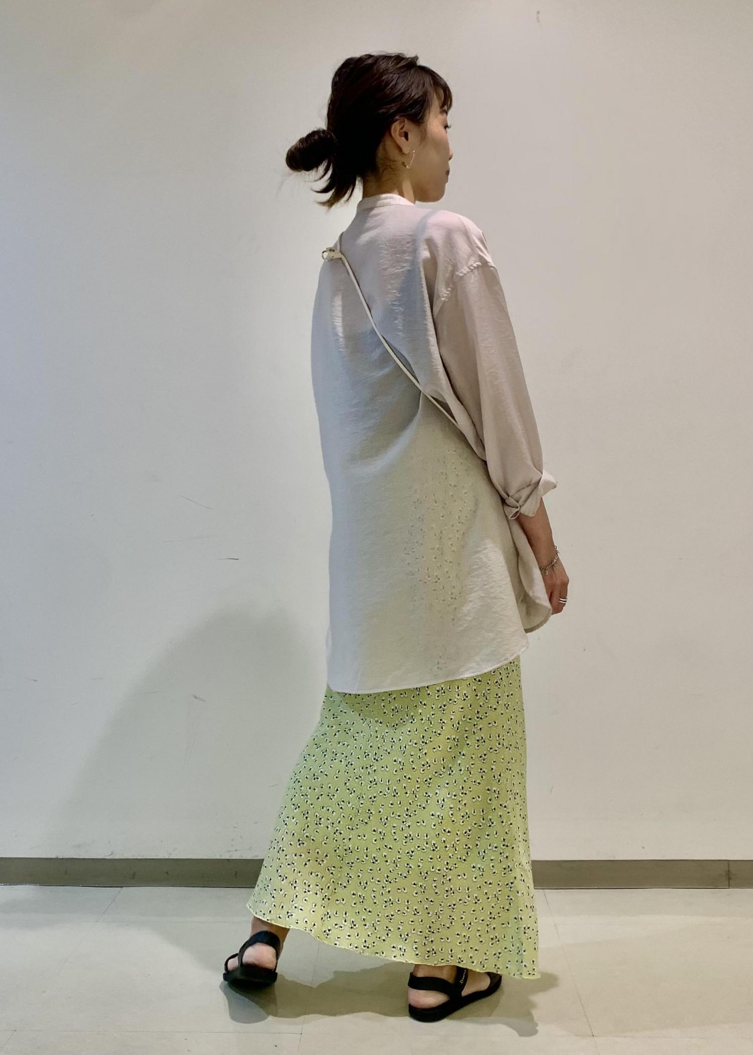 シアーシャツのボタンは開けずブラウスとしてゆったり着用し、ボトムをタイトな女性らしいシルエットのアイテムと合わせ、バランスの取れたコーディネートに仕上げました。