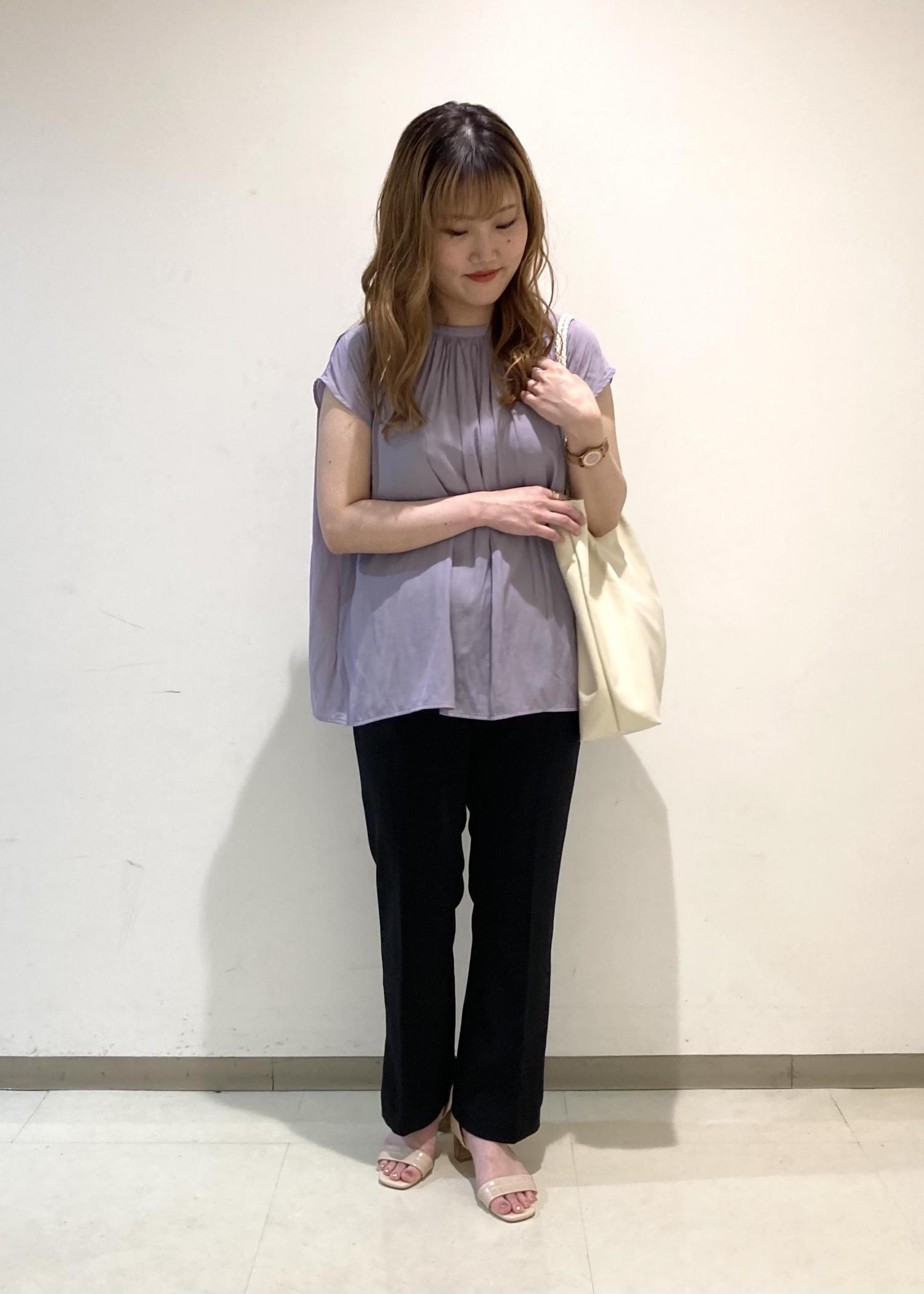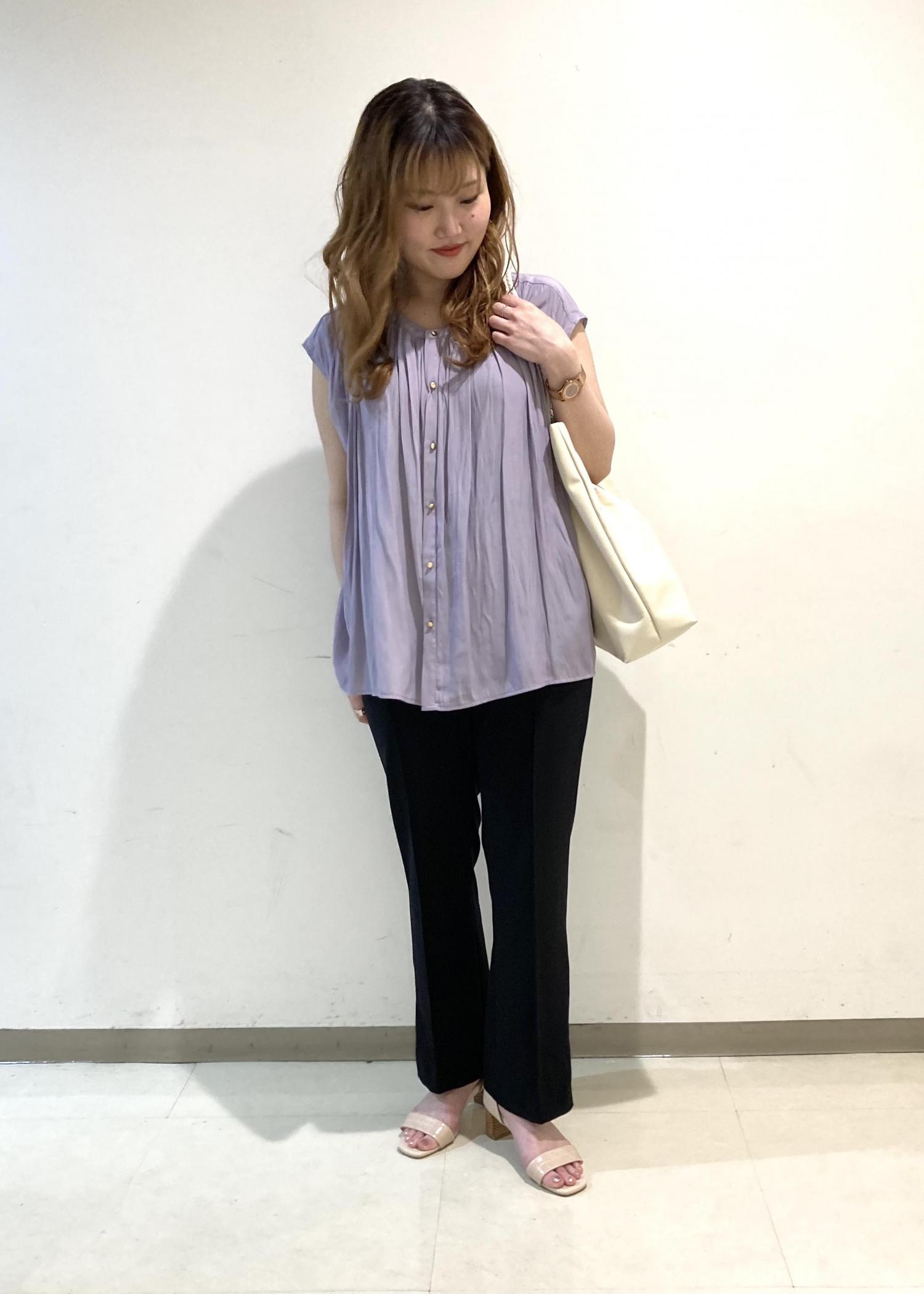 ブラウス+パンツのきれいめスタイルです。 シンプルですがブラウスをラベンダーにすることで華やかな印象に仕上げました。 普段遣いでも、お仕事着としてもお使い頂けるのでとてもおすすめですよ!