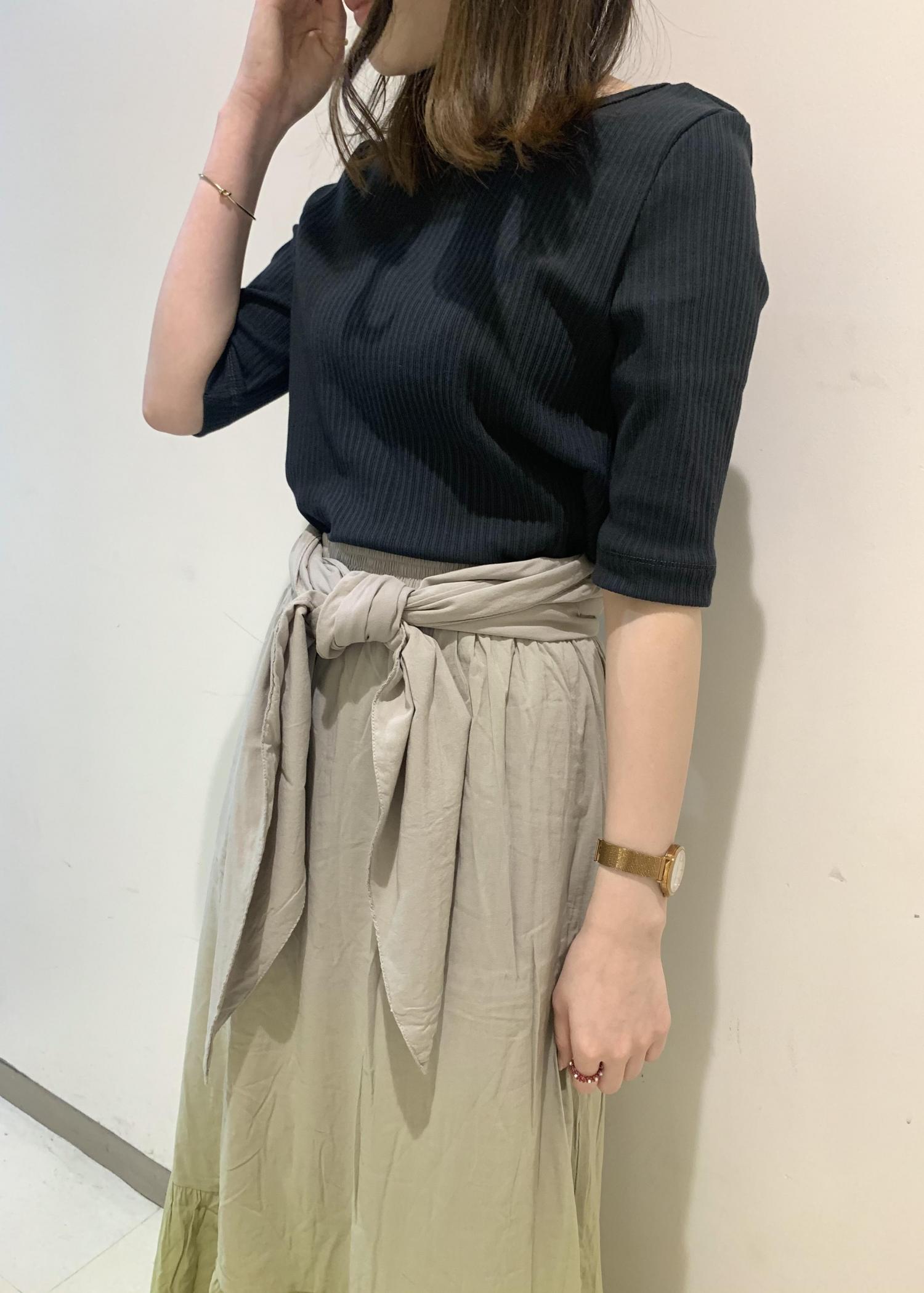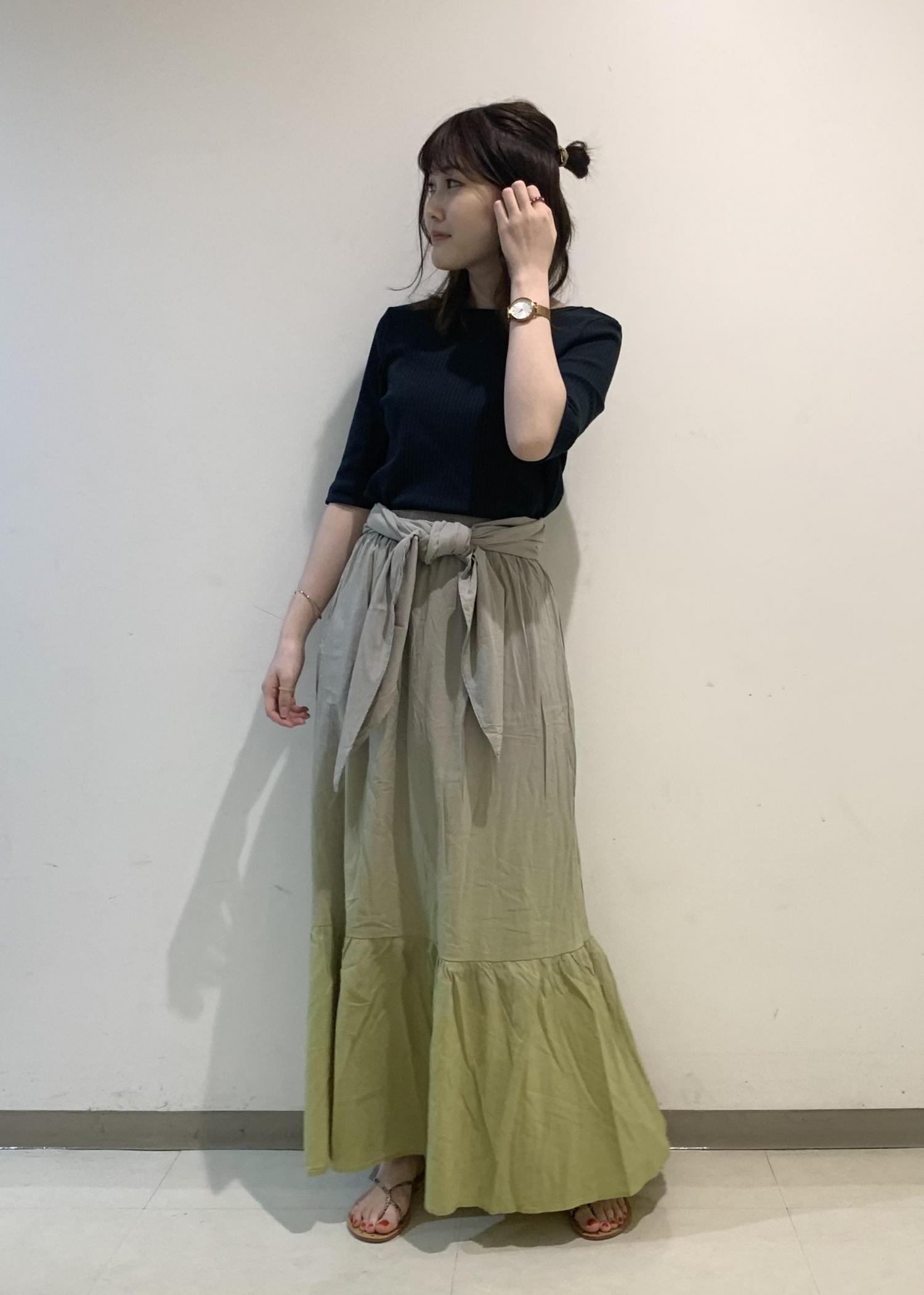 バックスタイルがポイントのトップスにグラデーションが爽やかな印象にさせるスカートを合わせたサマースタイル。