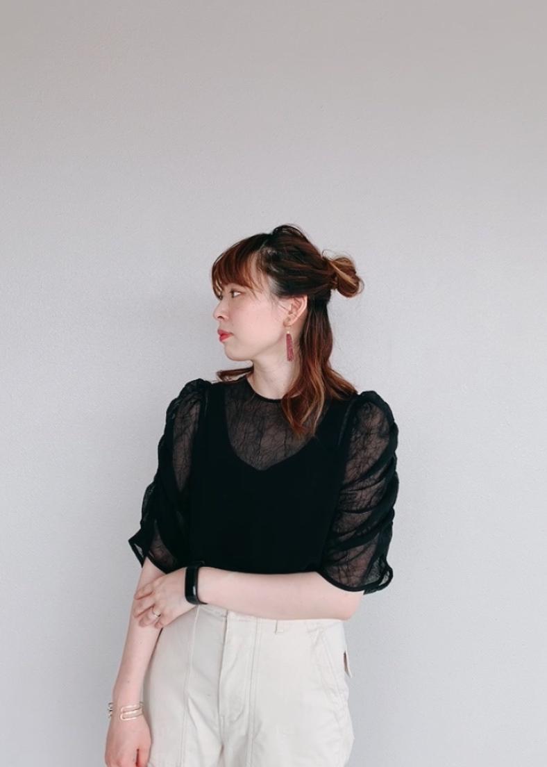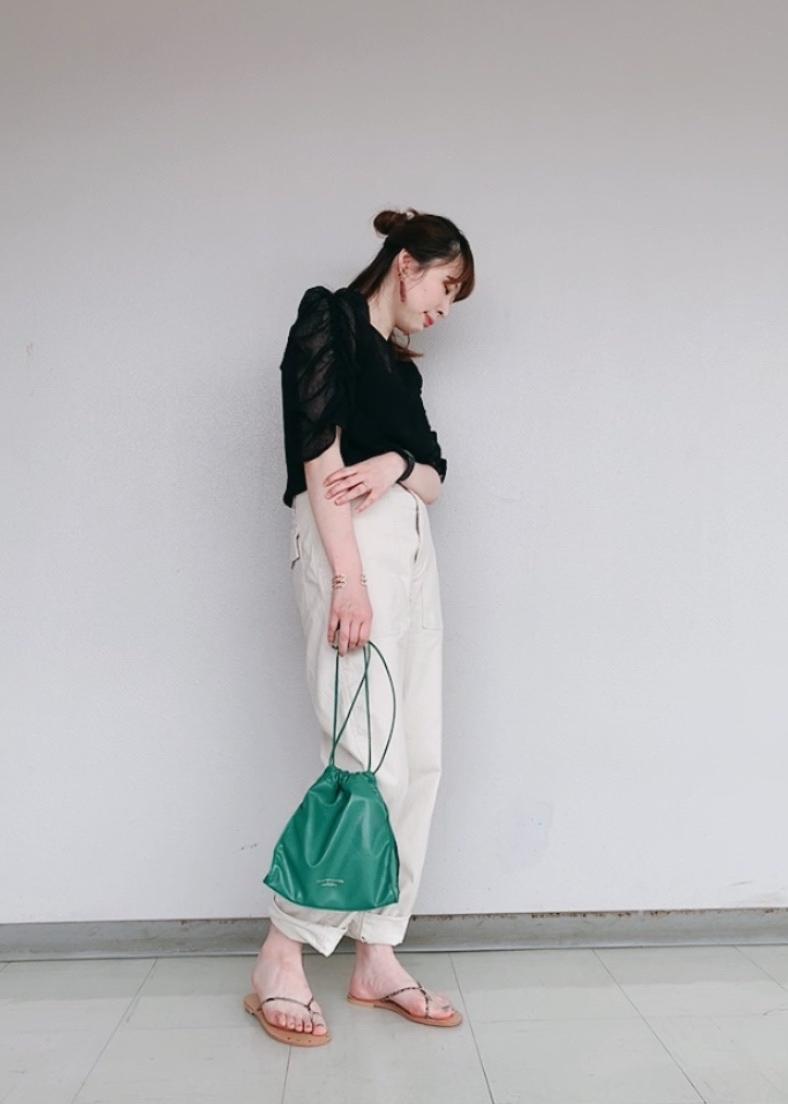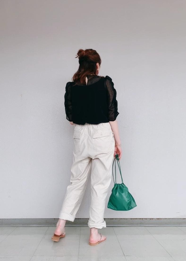 甘くなりやすいシアーブラウスにシンプルなカラーのベイカーパンツを合わせたカジュアルなスタイリングです。