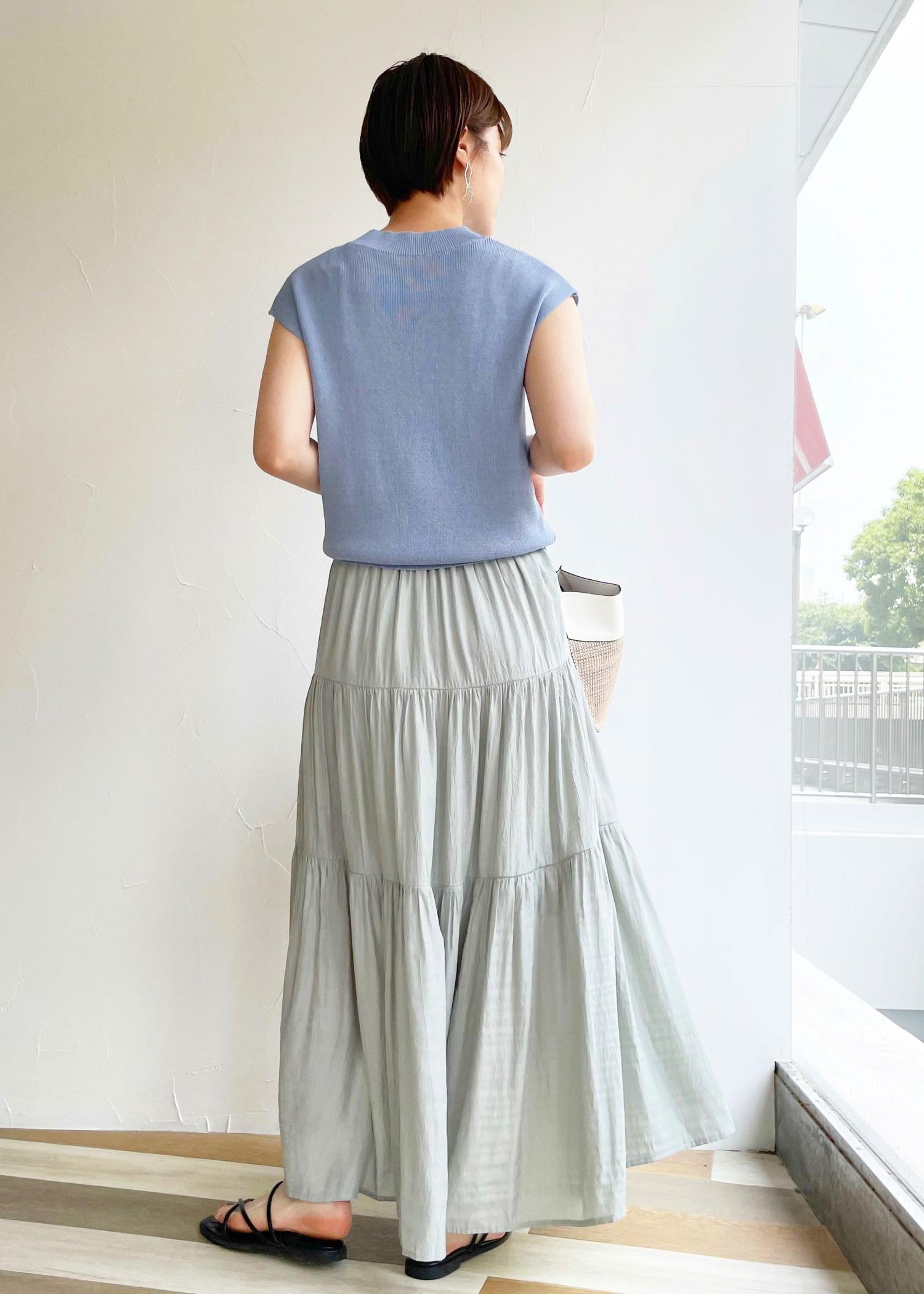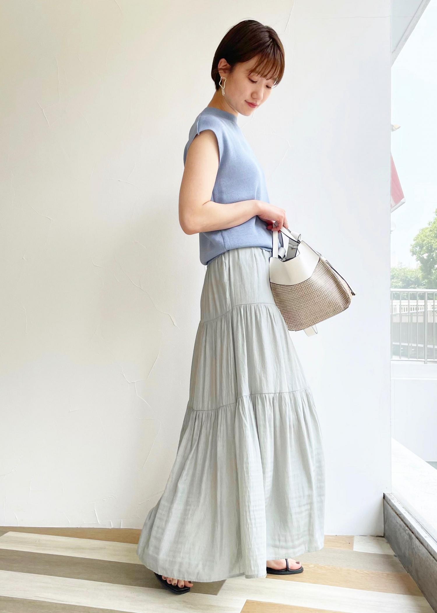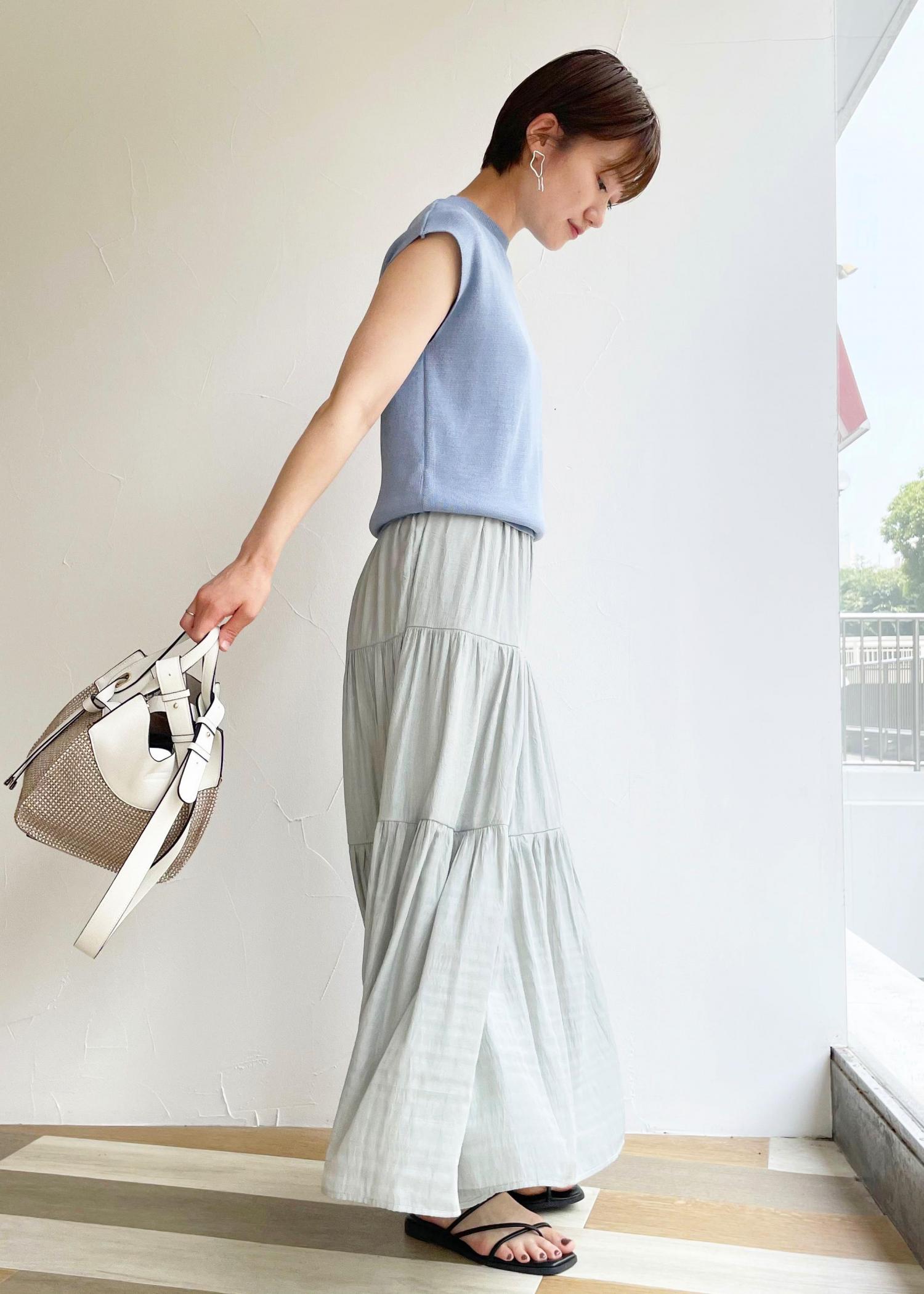 シワ加工が涼しげなドッキングワンピースを使ったコーディネートです。