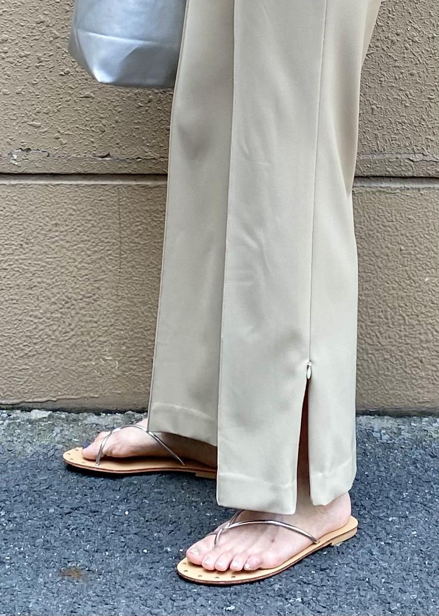 ブルーのニットに綺麗めのベージュカラーのパンツを合わせ、小物はシルバーでまとめて爽やかなスタイリングに。パンツはサイドのジップを開けられる仕様で、夏でも涼しくお召し頂けますよ。