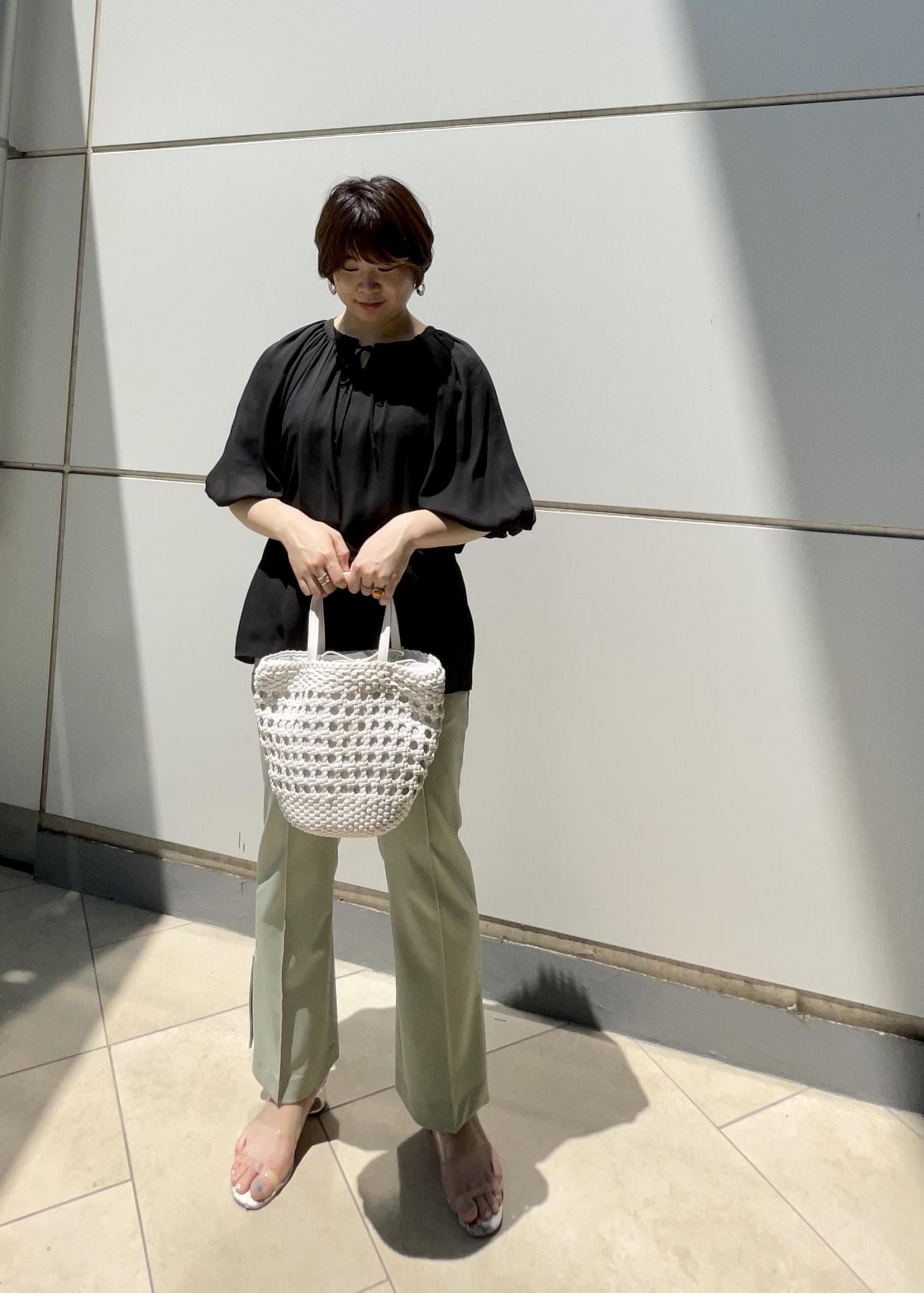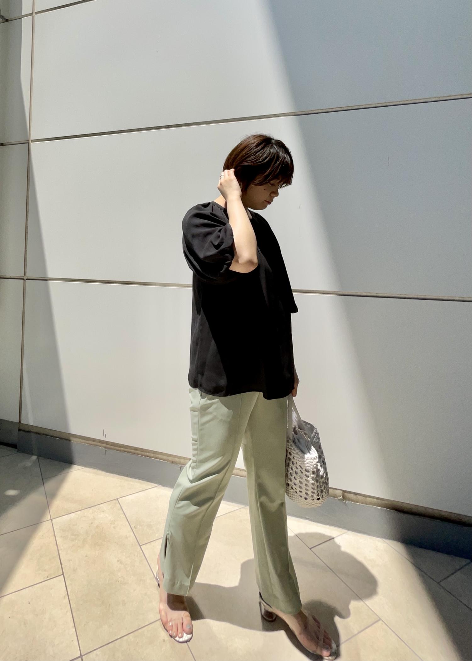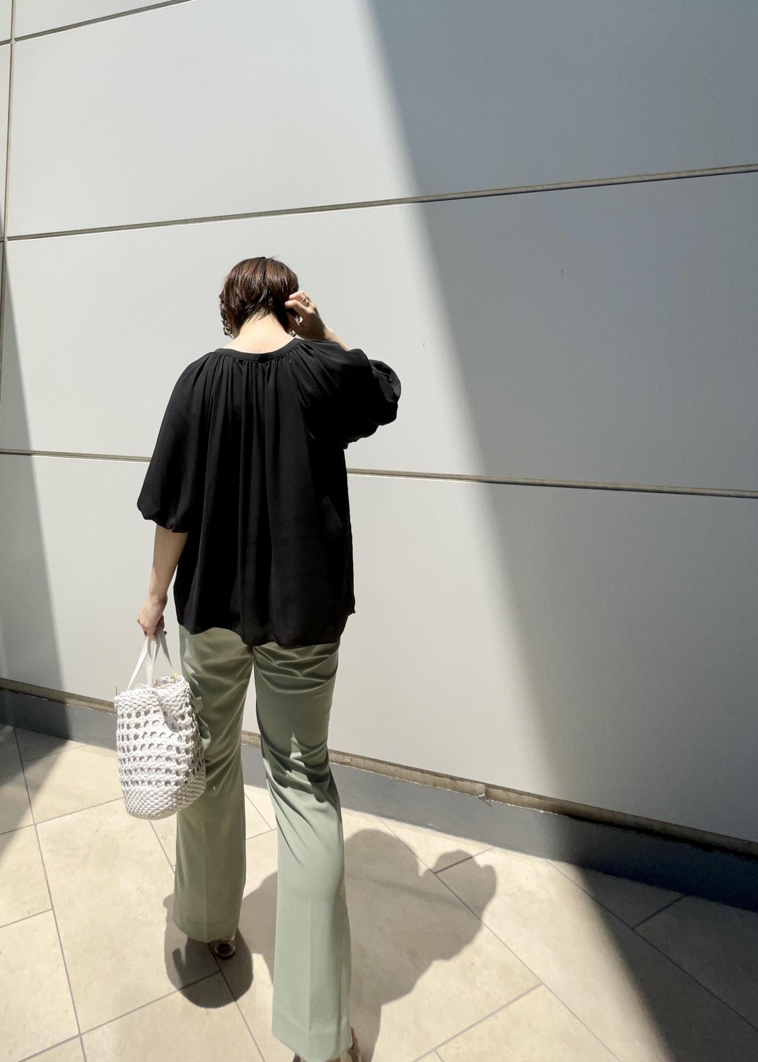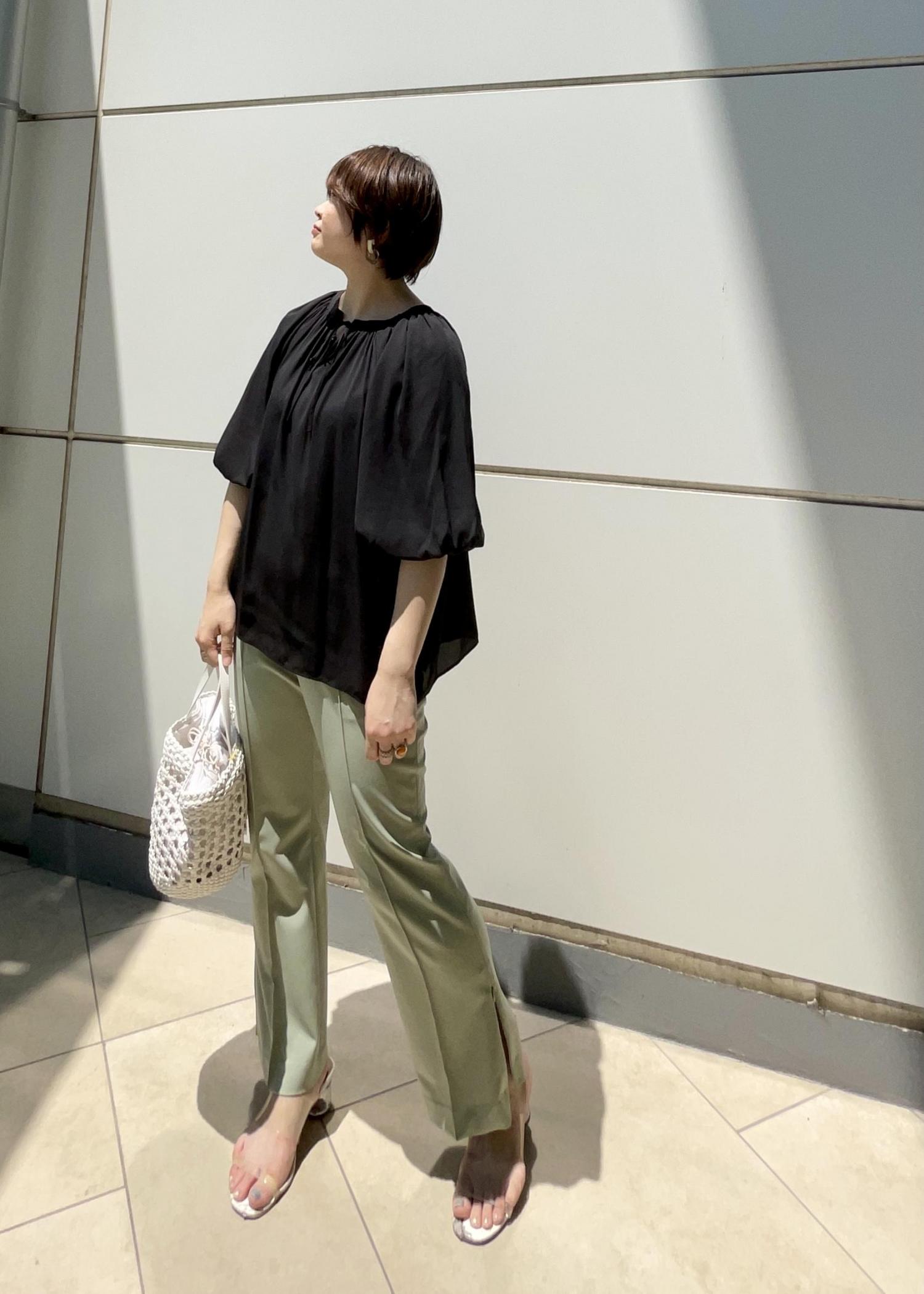 デザインブラウスに履き心地のよいパンツを合わせ、シンプルにコーディネートしました。ブラックとグリーンの色合わせで色物も大人っぽいイメージになります。