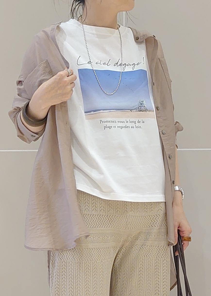 透かし編みのパンツとトレンドのシアーブラウスを使った、抜け感のある涼し気なコーディネイトにしてみました。