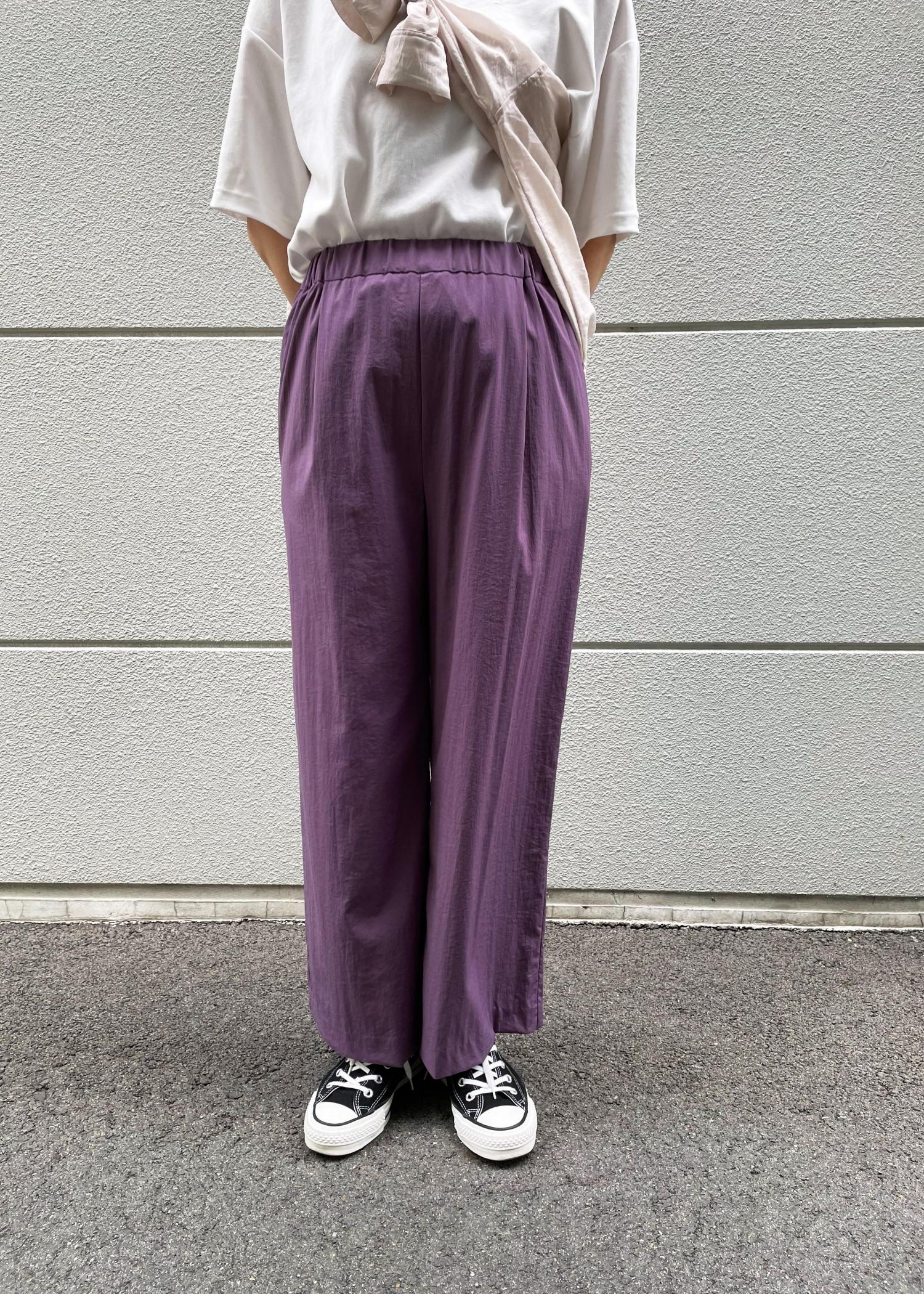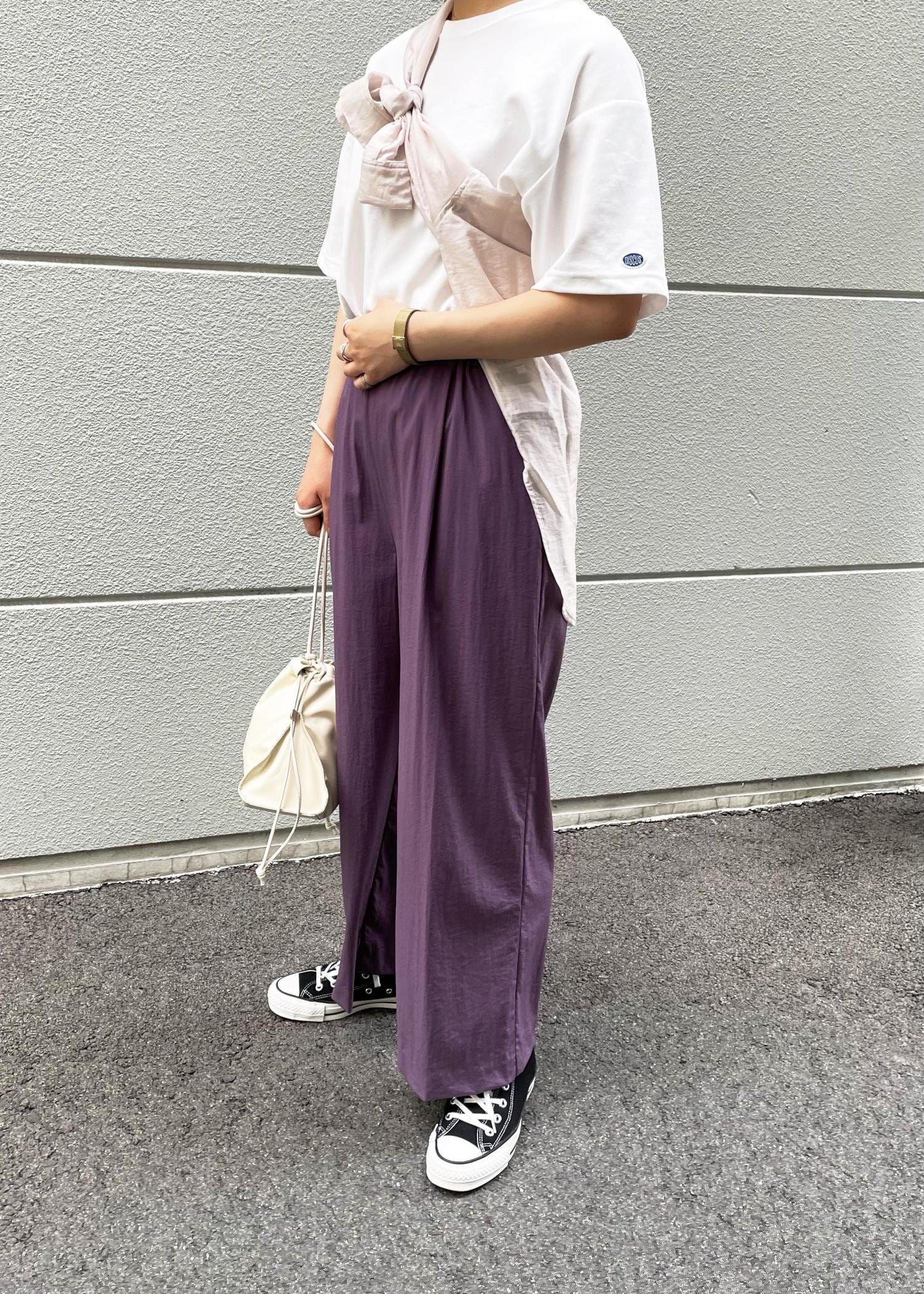 パープルのカラーを映させるために、他のアイテムはベーシックなカラーでまとめました。 シアーシャツは羽織りでも使いやすいですが、今回はたすき掛けで合わせてみました。このシャツひとつで一気にトレンド感がでます。いろいろなコーディネートを楽しんでください!