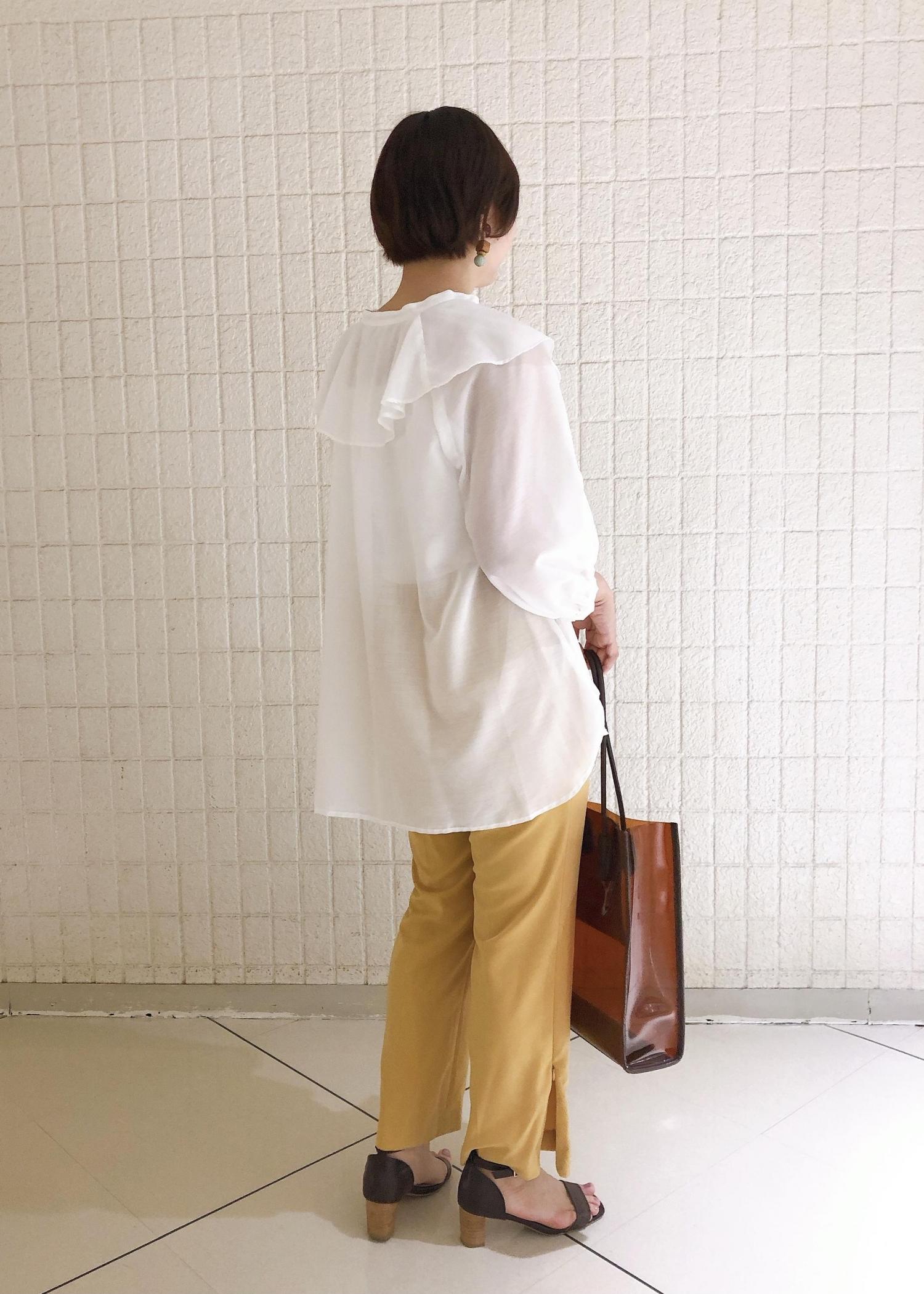 ケープ風のデザインで少し甘さがありつつも、イエローのパンツを合わせる事で、スッキリとした印象を与えた、大人のフェミニンコーデ◎