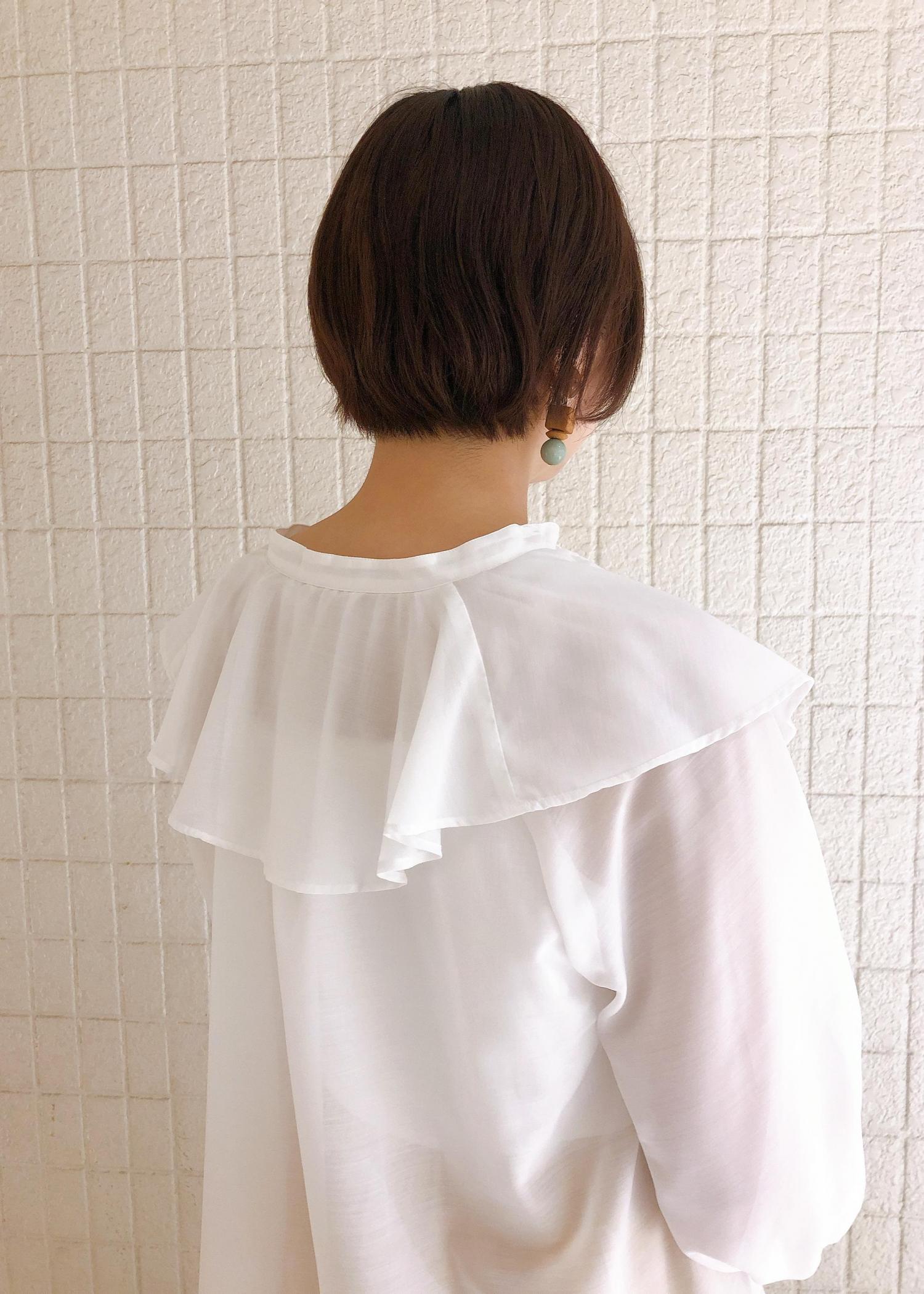 また、ブラウスの紐をあえて結ばない事で抜け感の出るスタイリングにし、小物アイテムは色味を統一する事で、バランスの取れたカラーリングに仕上げました。