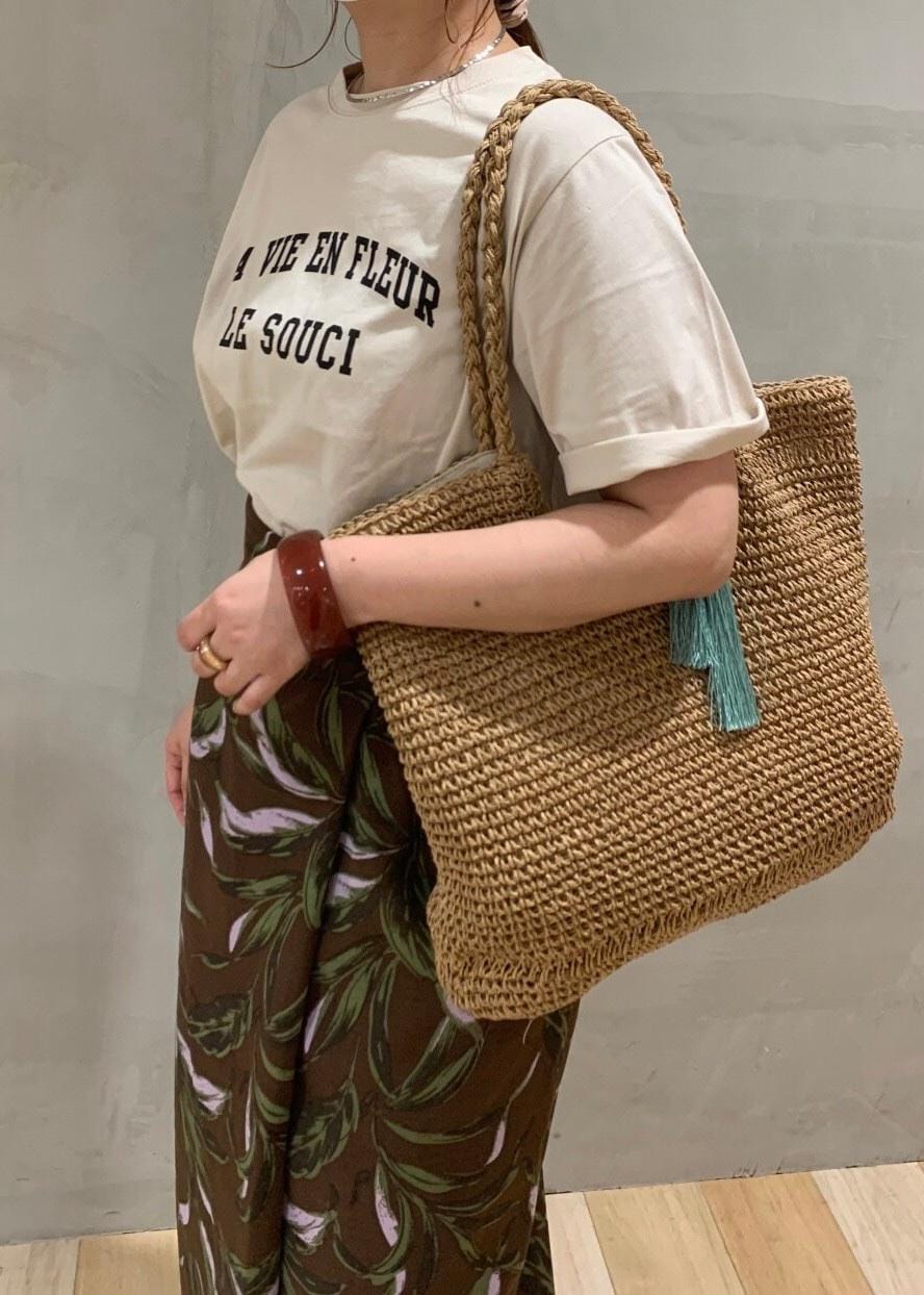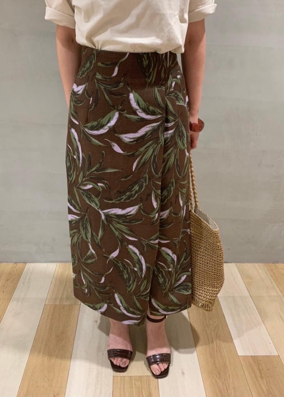 リーフ柄スカートを主役にリラックスコーデに仕上げました。