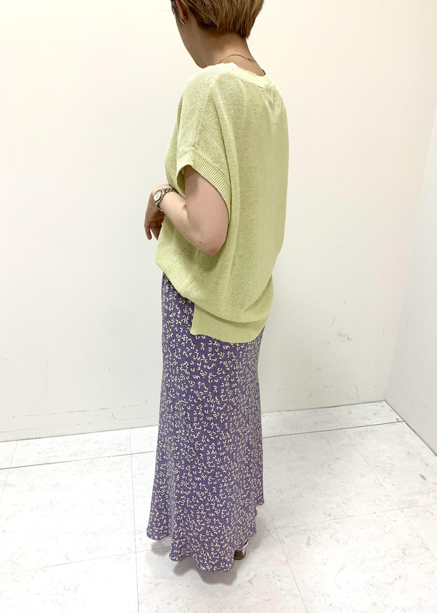 元気なイエローカラーのサマーニットは風通しもよく、ゆったりしているので、細身のロングスカートと合わせて、スッキリ見えるようにしました♪