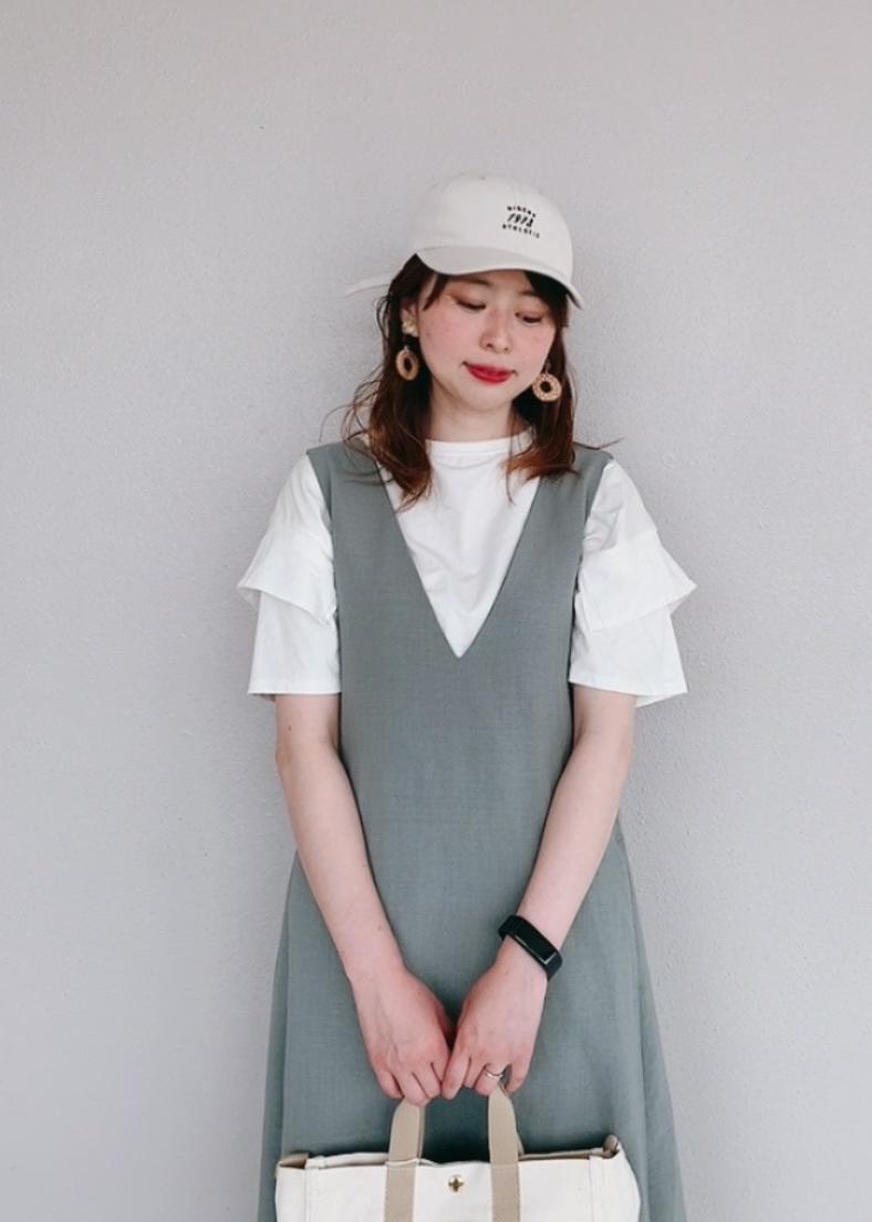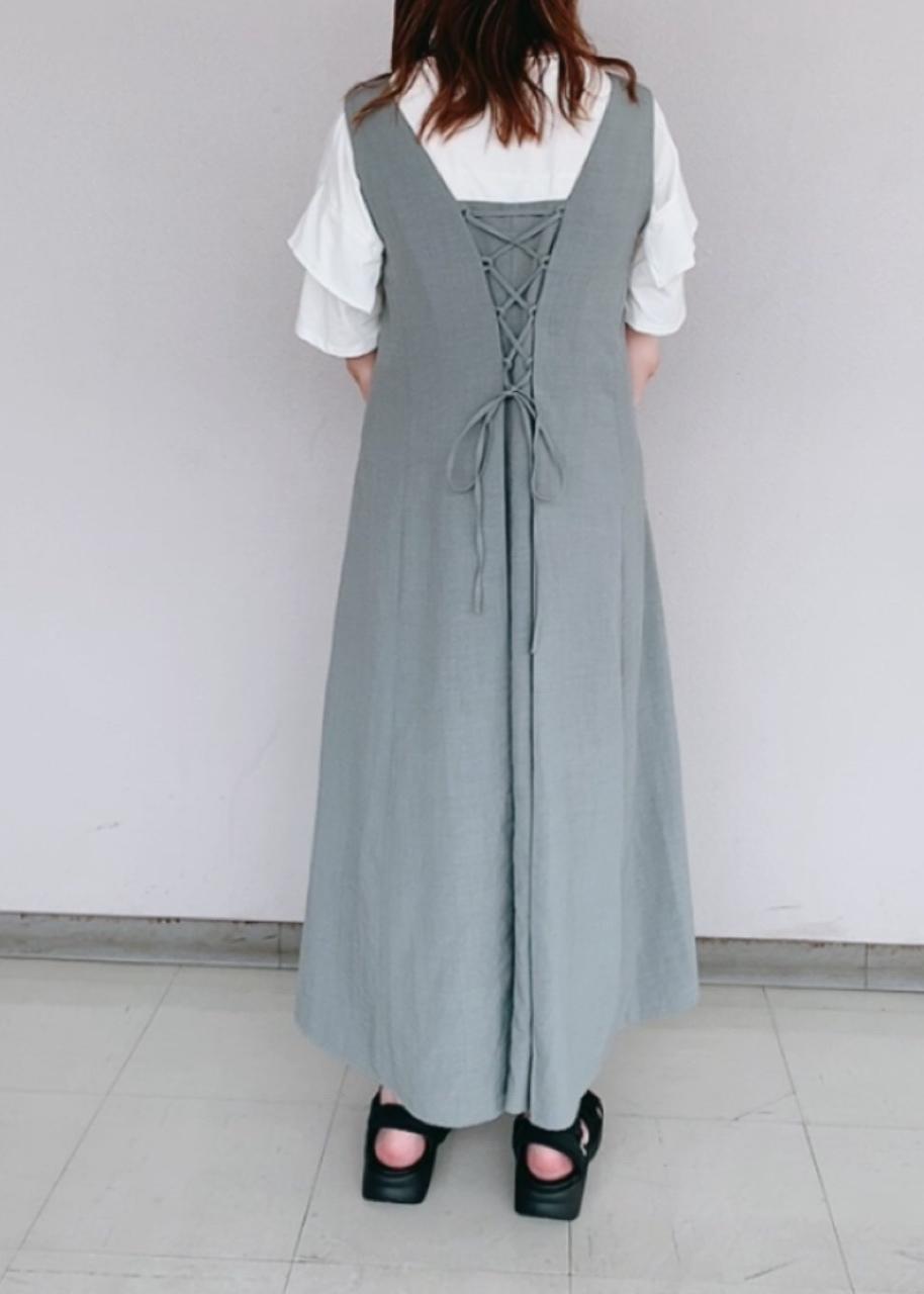 お袖にデザインが入ってるTシャツにレースアップワンピースを合わせた、普段使いしやすいコーディネートです。