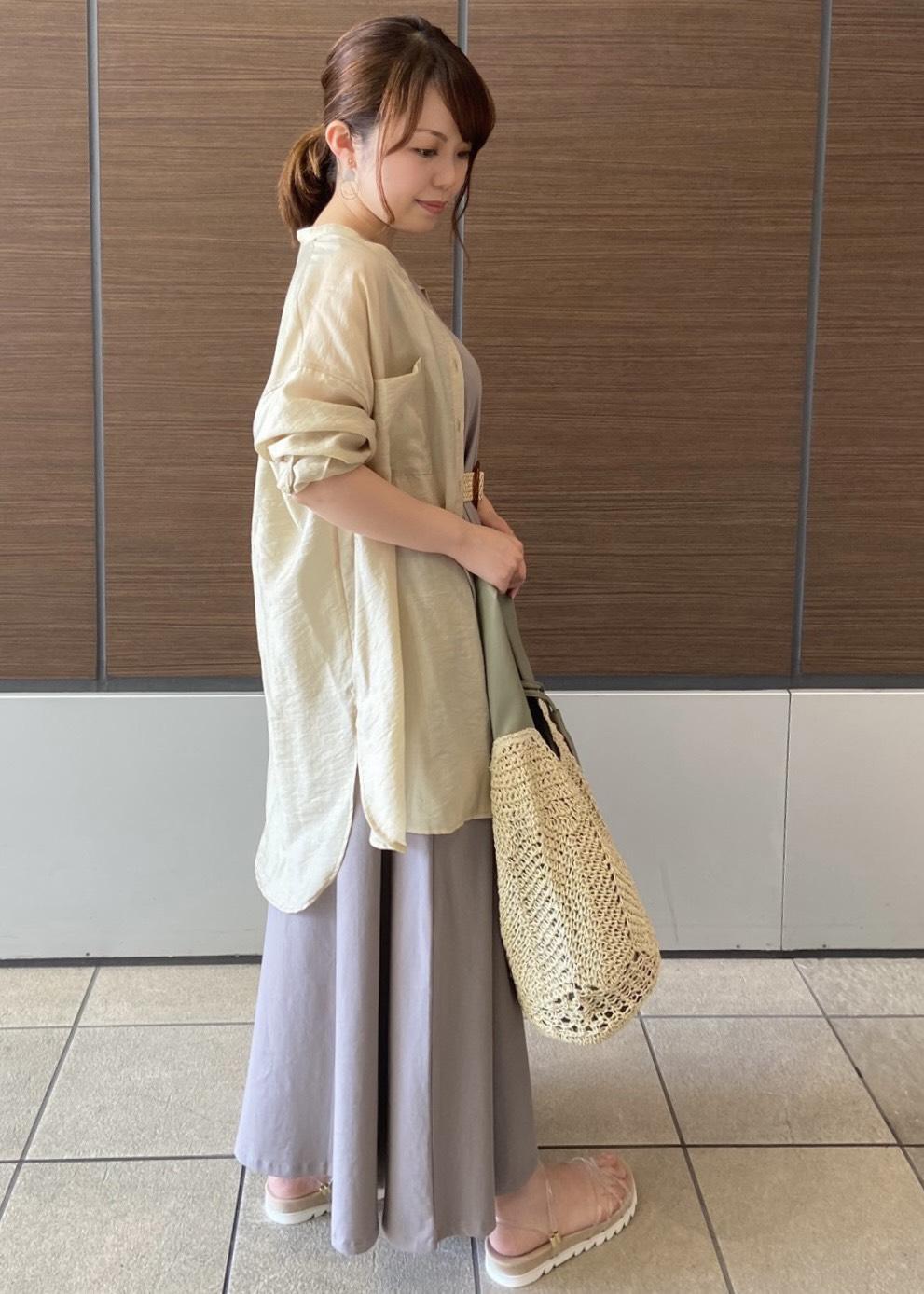 これからの時期に嬉しい楽ちんワンピースコーデです! ワンピースはAラインシルエットで1枚で着てもサマに見えるワンピースですが、トレンドのシアーシャツにベルトを合わせてカジュアル過ぎないコーディネートにしました。ワンピースは低身長さんも着やすい丈でおすすめです!