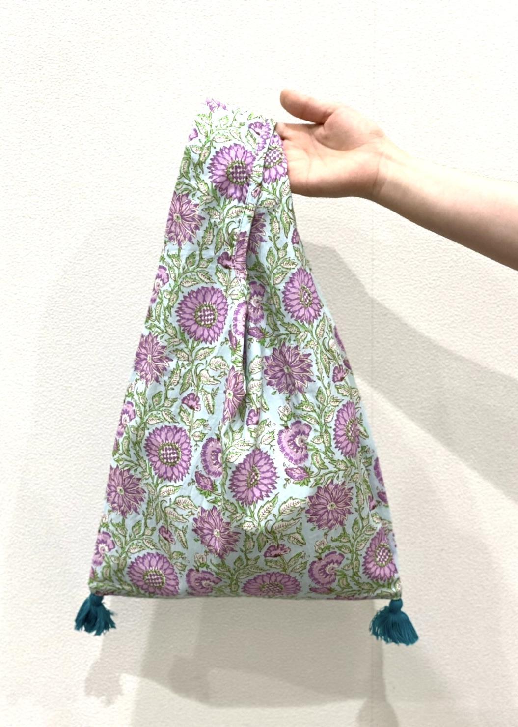 パープルカラーと花柄bagでアクセントカラーを入れて、さりげなくお洒落度アップ。トップス、サンダルはシンプルにすることで大人なコーデにしてます。