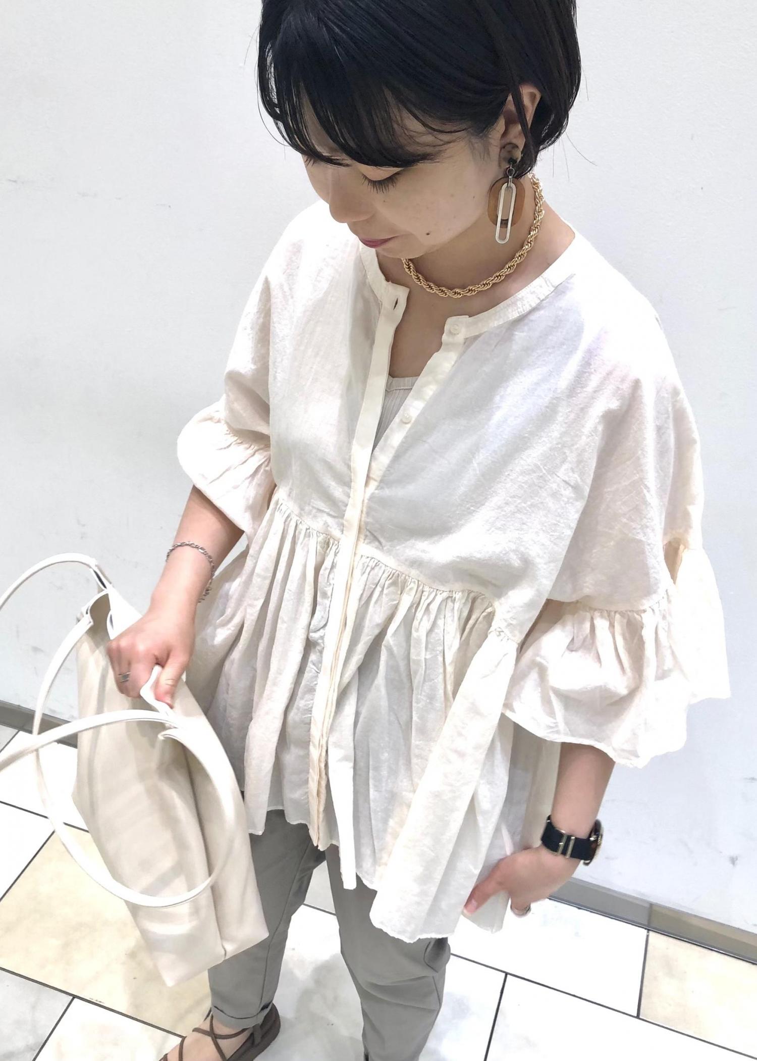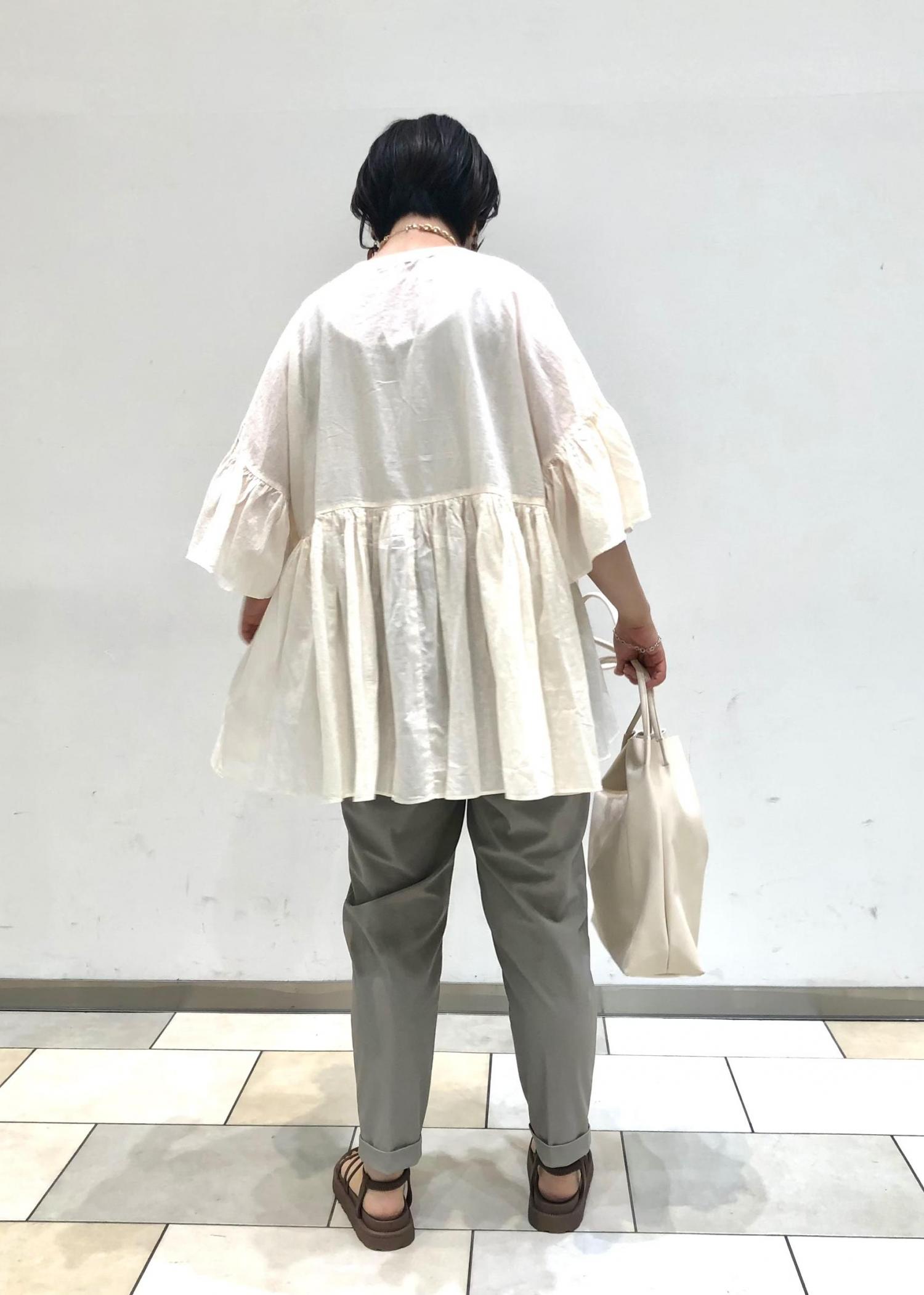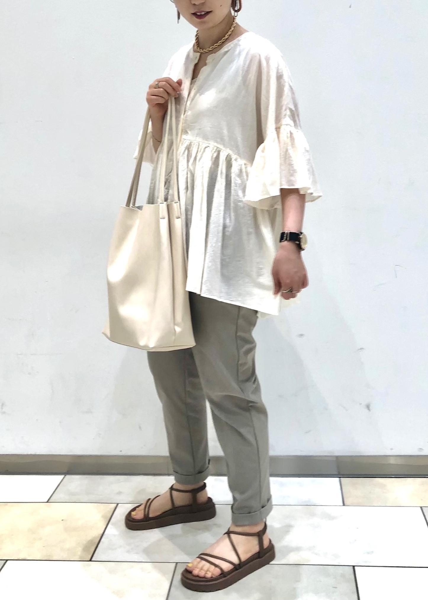 全体のカラーをアースカラーでまとめてナチュラルな雰囲気に。 ブラウスも環境に優しいオーガニックコットンを使ったアイテムで見た目だけでなく素材もナチュラルなコーディネートを目指しました。