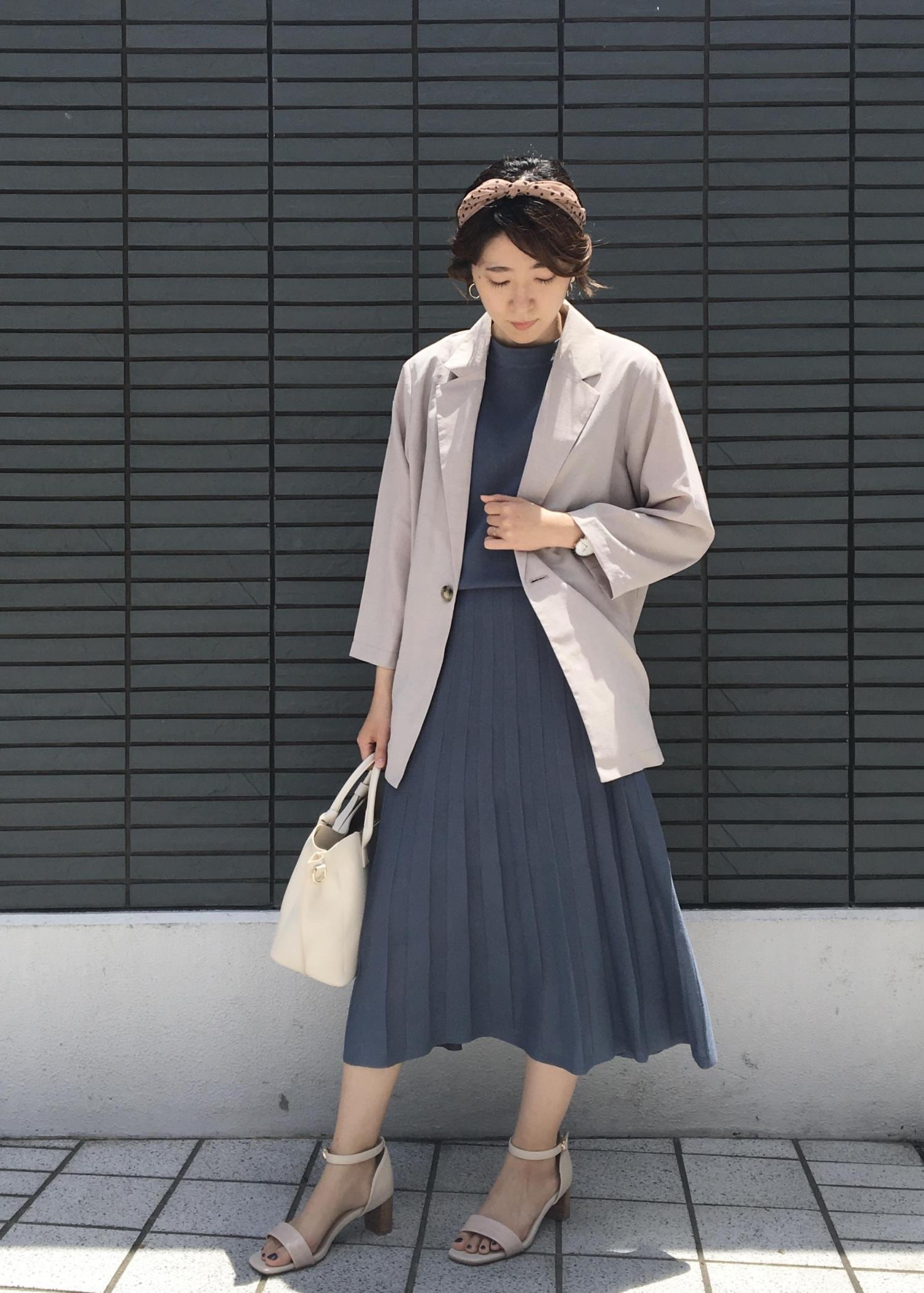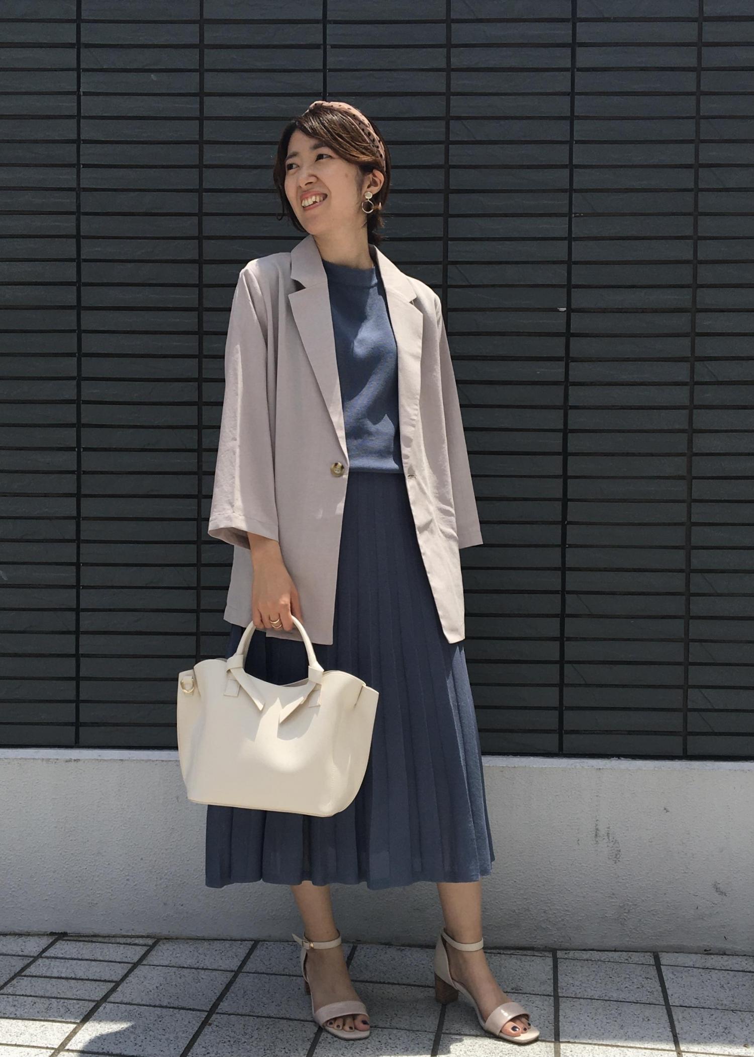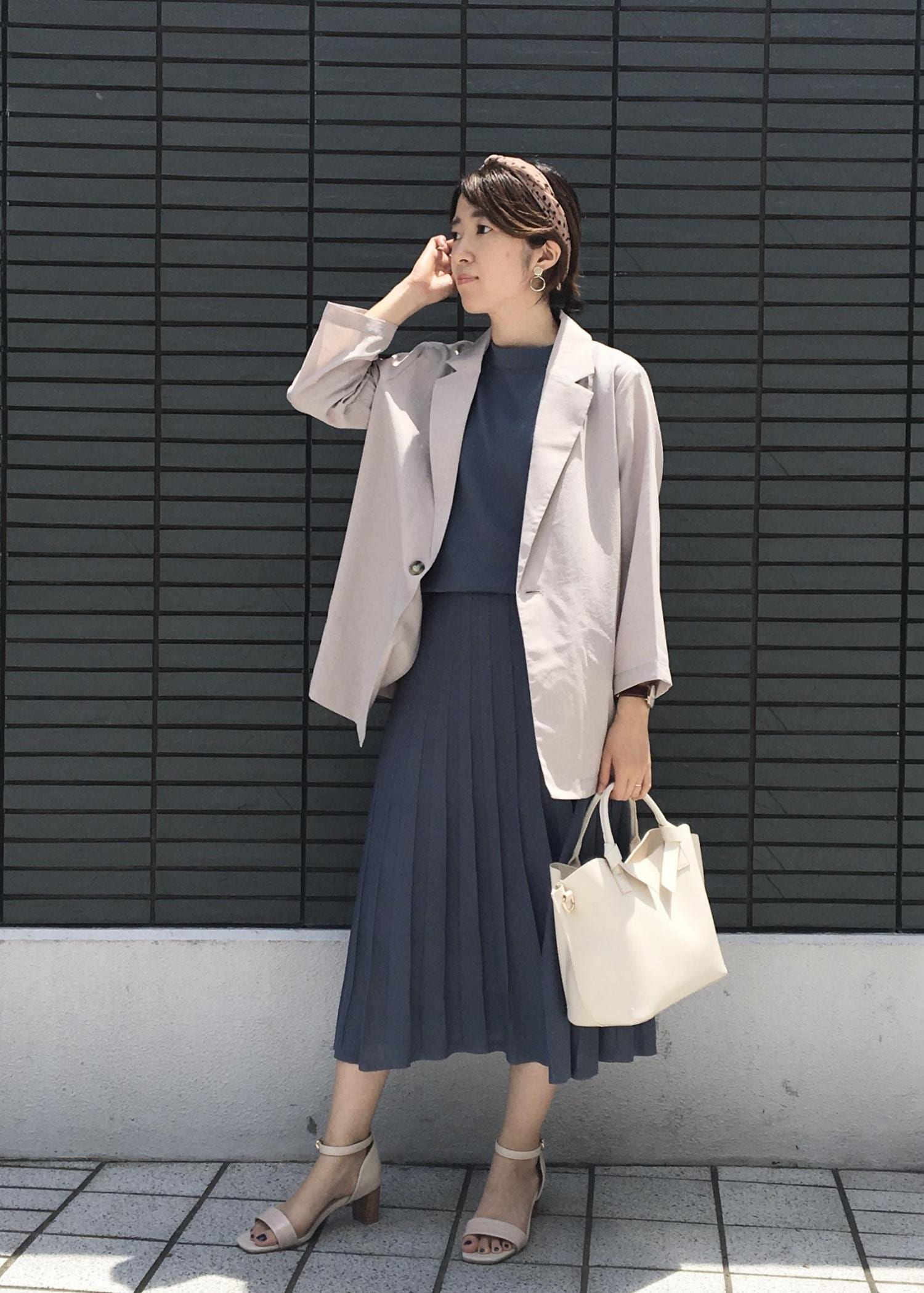 フレンチスリーブのワンピースにリラックス感のあるジャケットを合わせました。