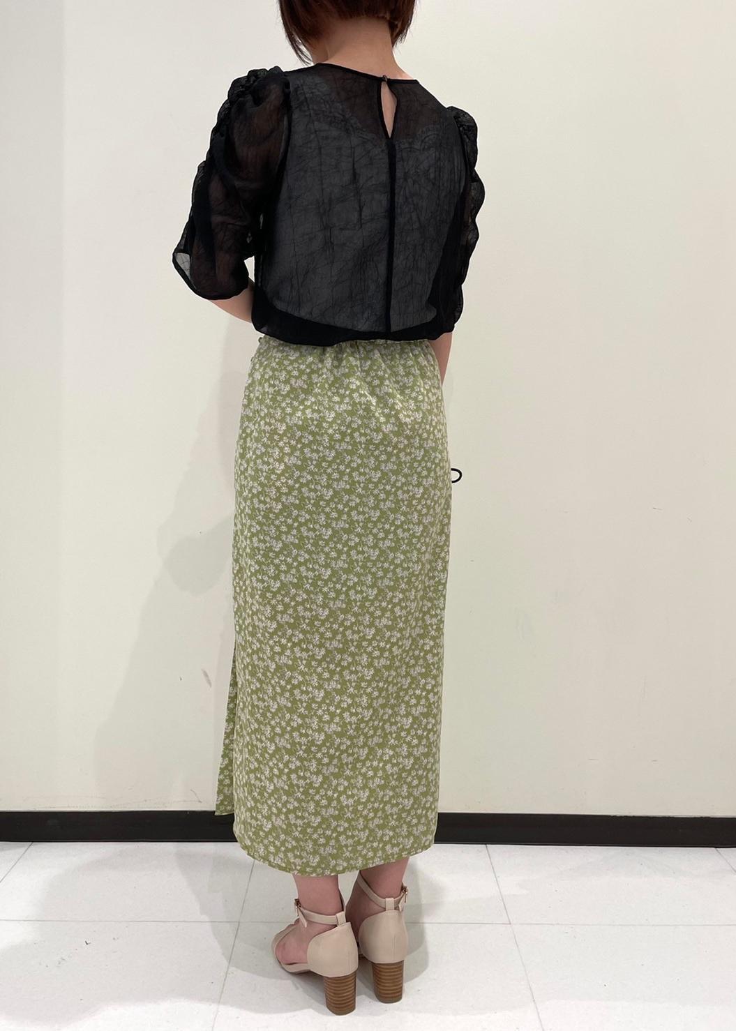 ピスタチオカラーの花柄スカートに黒のブラウスを合わせることで大人でも抵抗無く着れる花柄コーデに仕上げてみました!