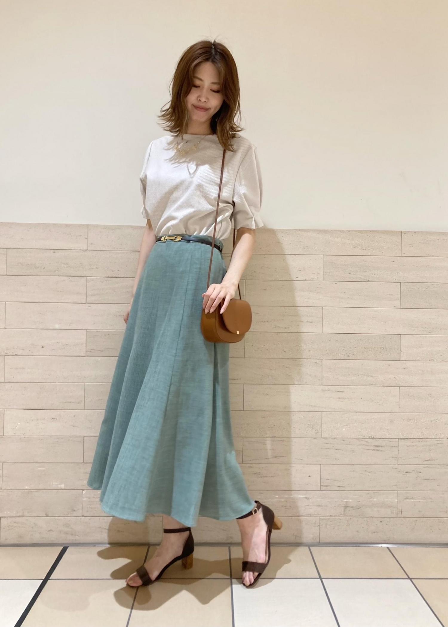 グリーンのマーメイドスカートをメインに、カラーは柔らかくまとまるようにベージュのトップスを合わせました。