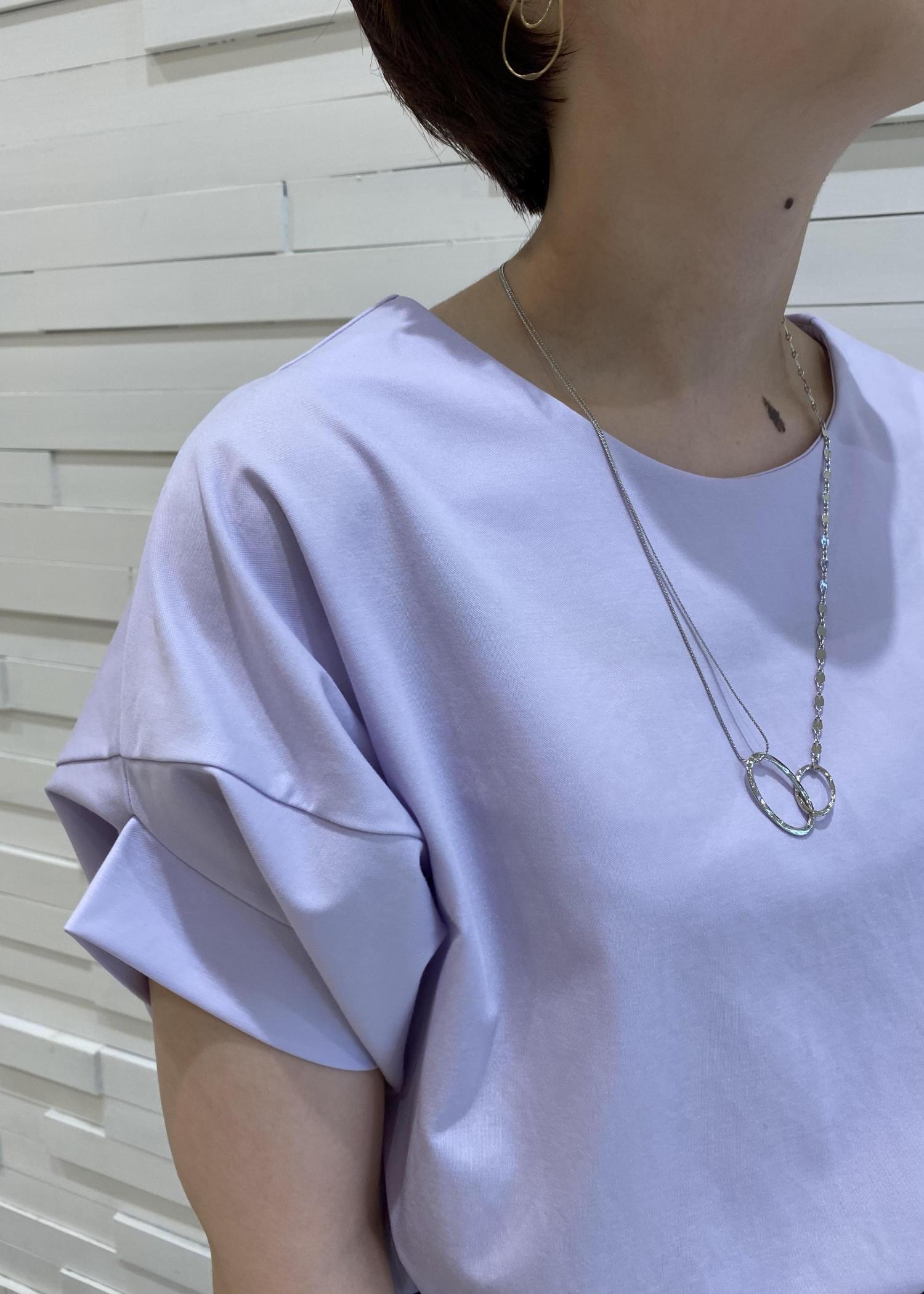 ラベンダーの色が上品な色合いで、通勤時等きれいめコーデにもぴったりです。 小物は白でまとめつつ、黒のパンツで全体のメリハリをつけてみました。