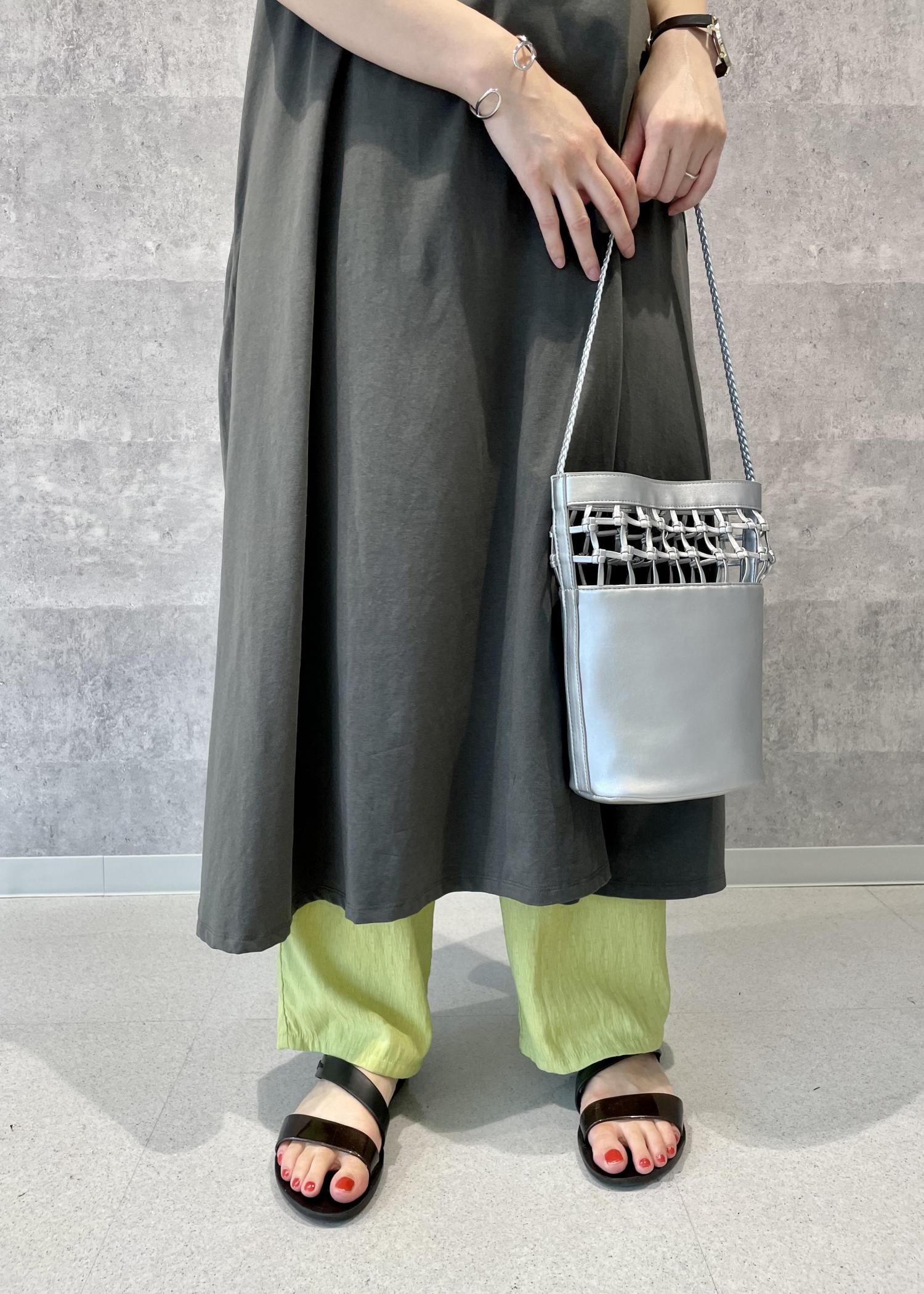 スミクロというシックなカラーのワンピースなので、夏らしく明るいカラーのパンツを合わせて、清涼感をプラスしています。 デザインがとにかくシンプルなので、小物もたくさん使用していますが、全てシルバーで統一しているところもポイントです。