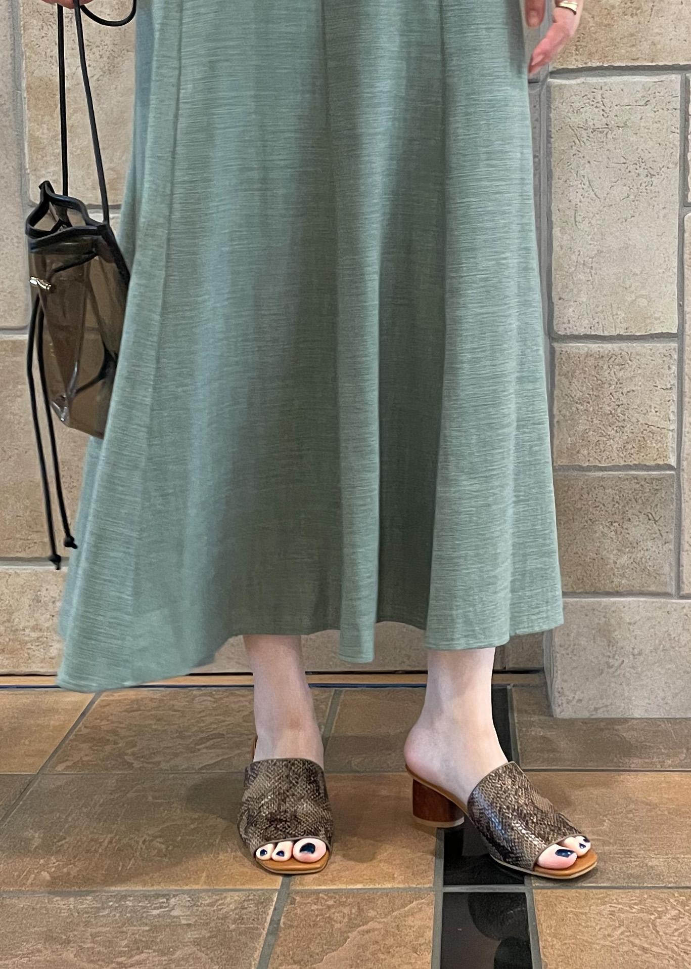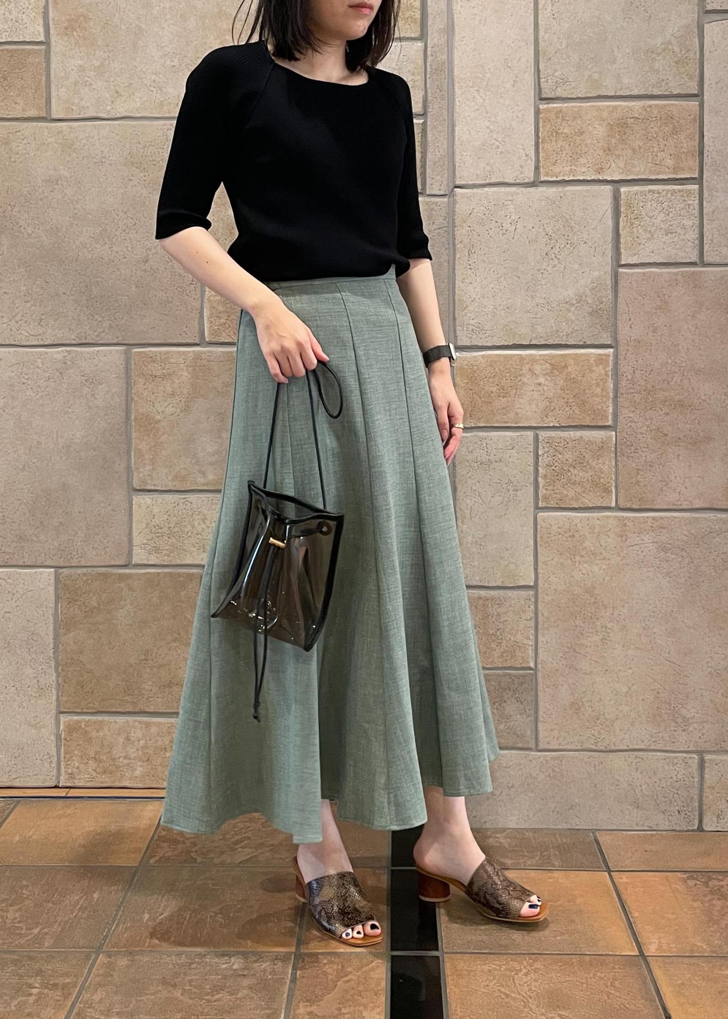 UVカット機能付きのトップスに麻のような素材感のマーメイドスカートを合わせ、爽やかなコーディネートに。