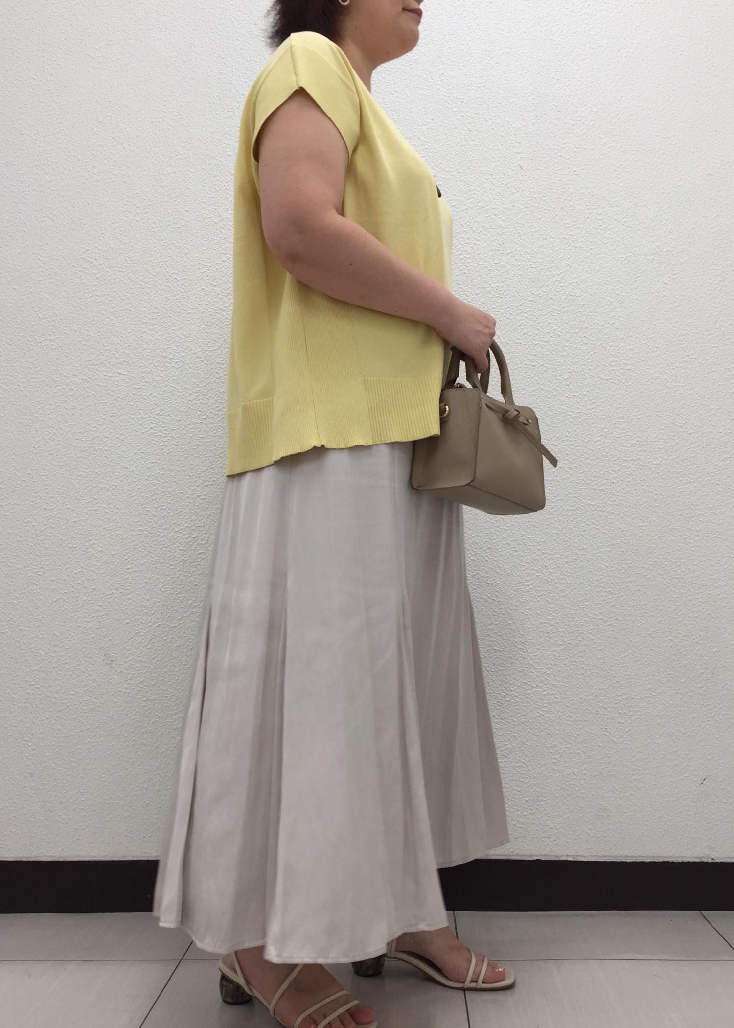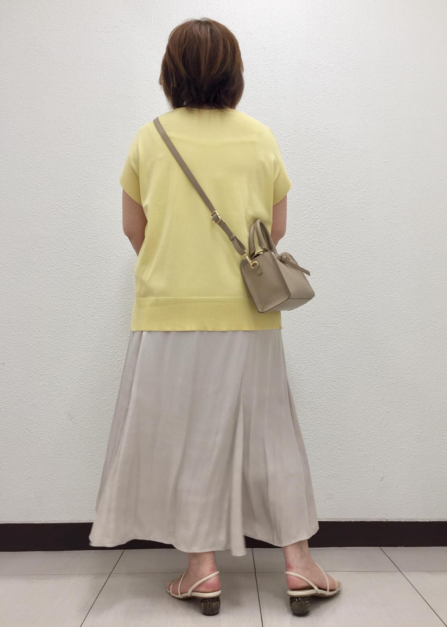 夏らしい爽やかイエローの大人コーデです。 落ち着いた雰囲気にしたかったので、バッグは華奢なものにしました。 ゆったりなポンチョ風ニットは体型カバーにもオススメです!