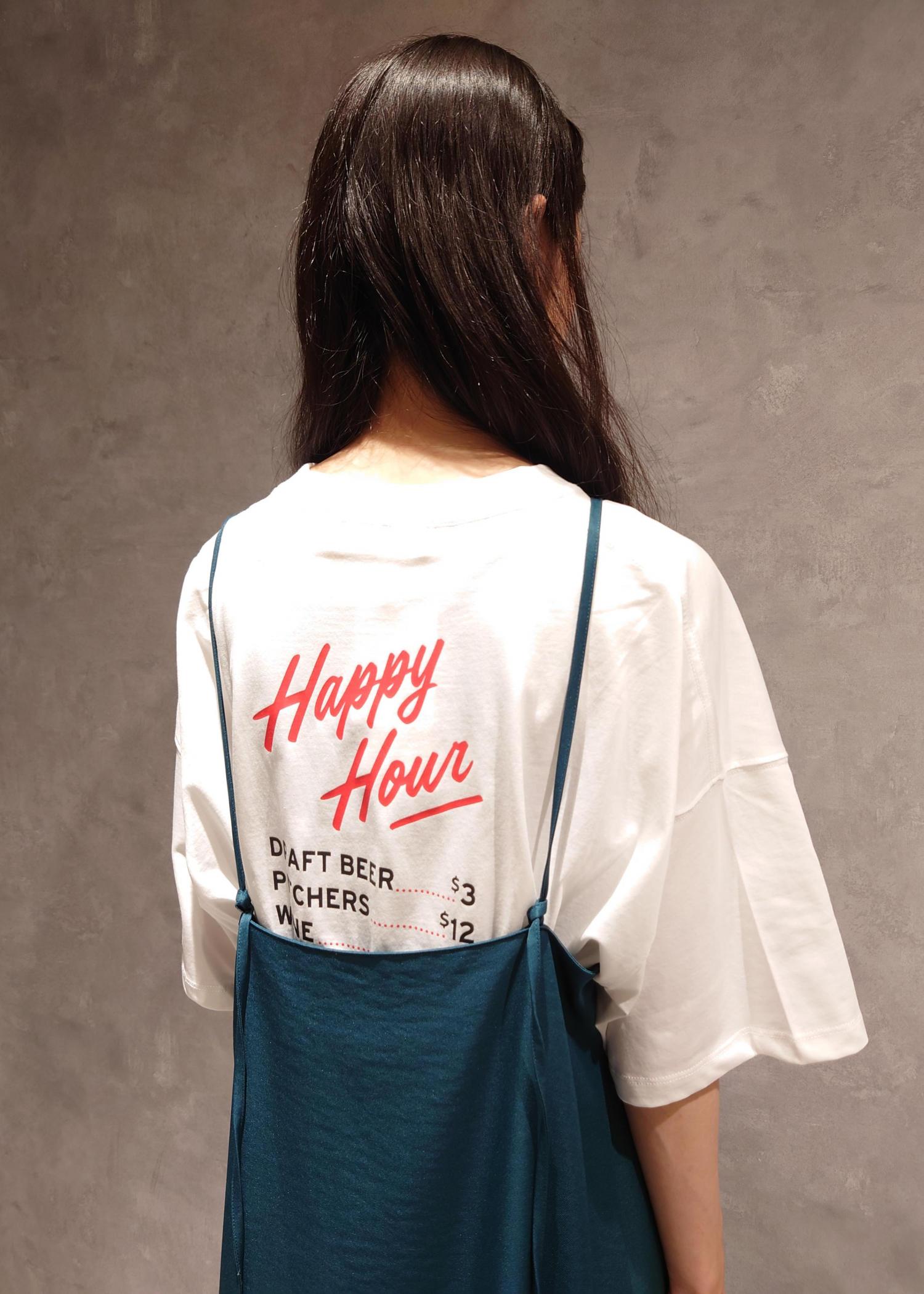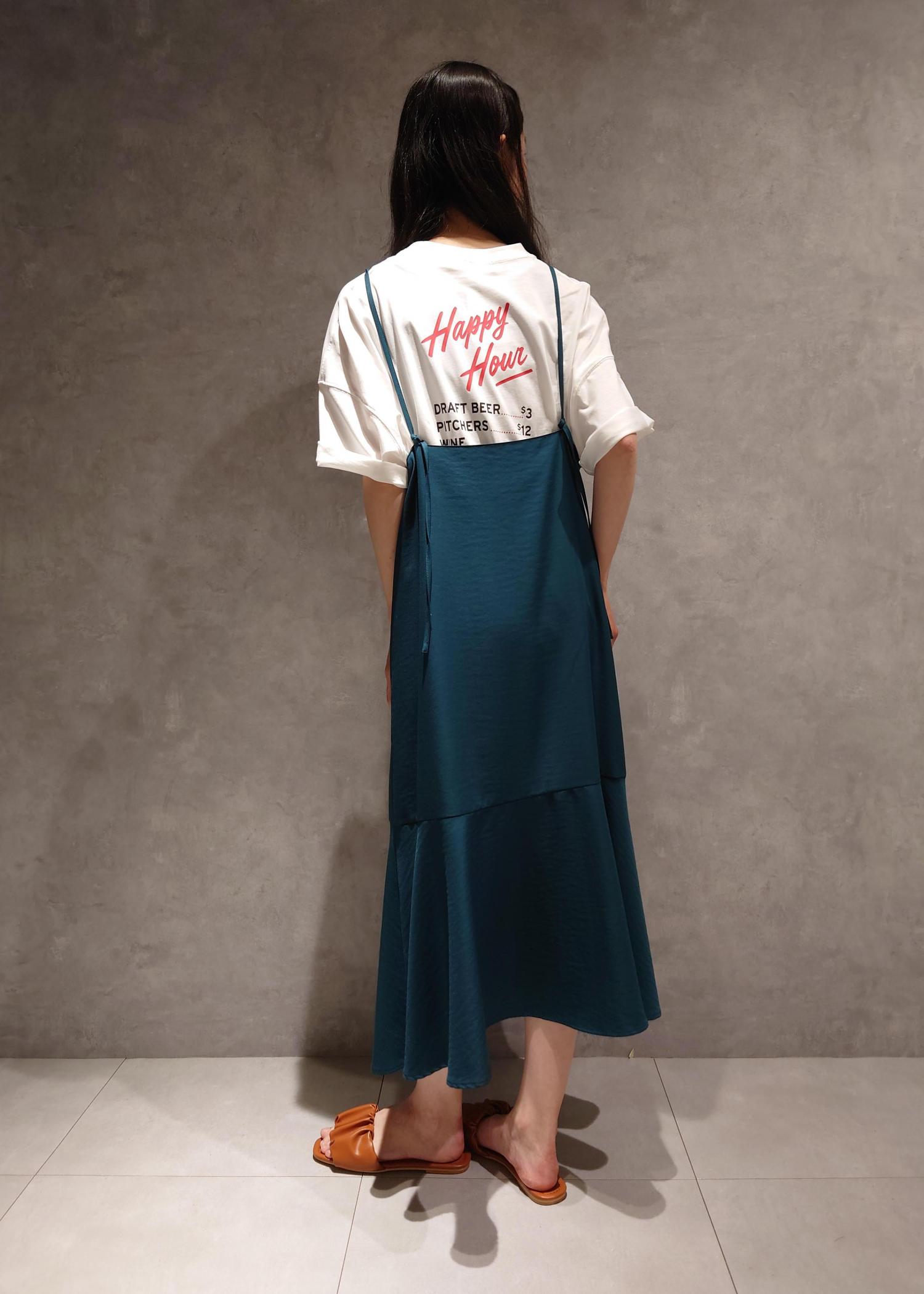 ゆったり着れるインナーに、光沢あるワンピースを合わせてカジュアルかつキレイめなコーデに。 バックのプリントがポップなので、コーディネートのアクセントになります。 おうち時間でも活躍できます。