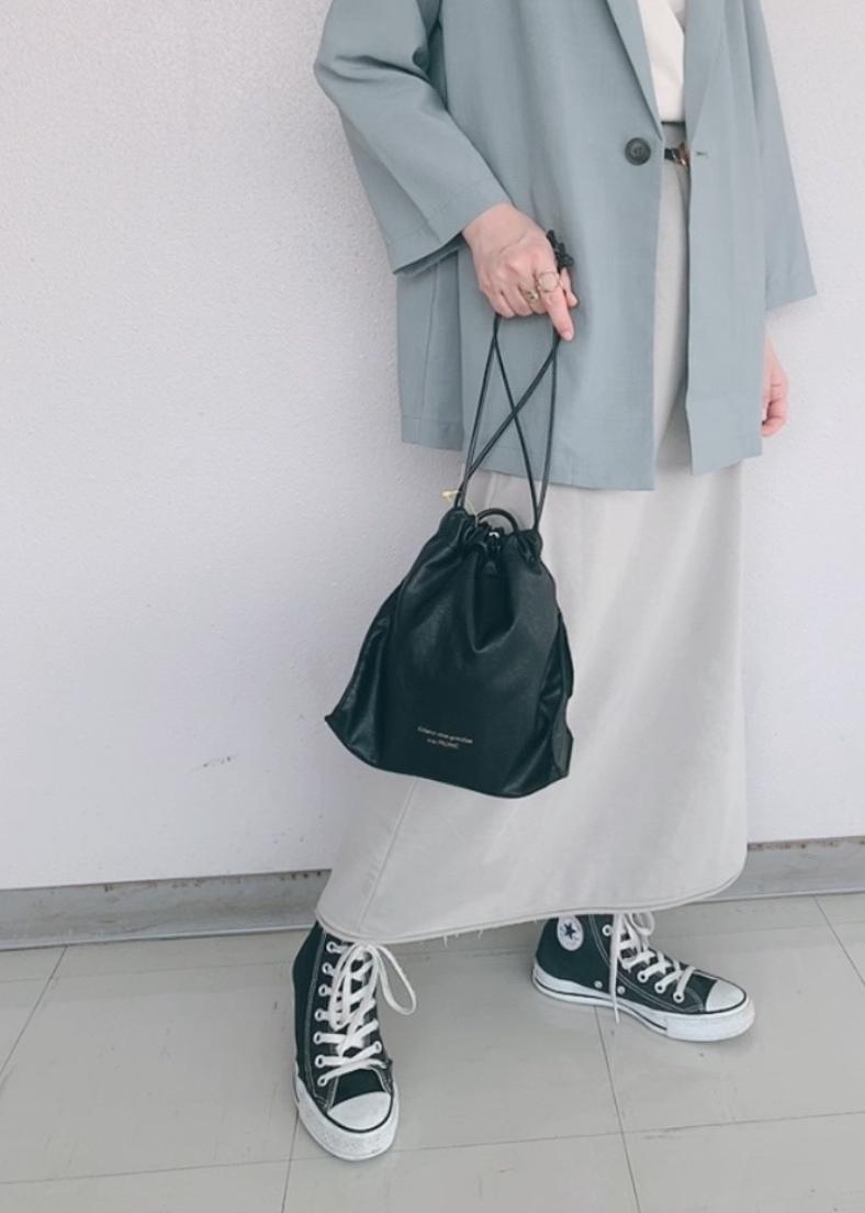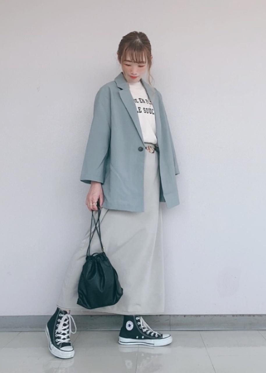 インナーにロゴTシャツを合わせ、足元はCONVERSEのハイカットスニーカーでまとめたカジュアルなスタイリングです。