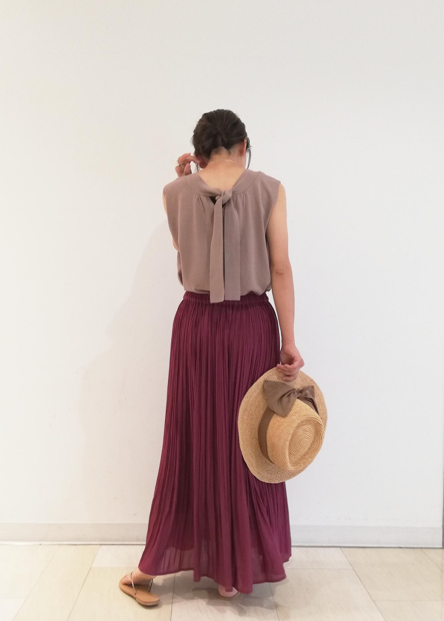 前後2WAYでお召しいただけるニットをうしろリボンでコーディネートしました。 デザインが映えるように、ヘアスタイルはまとめるのがおすすめ。